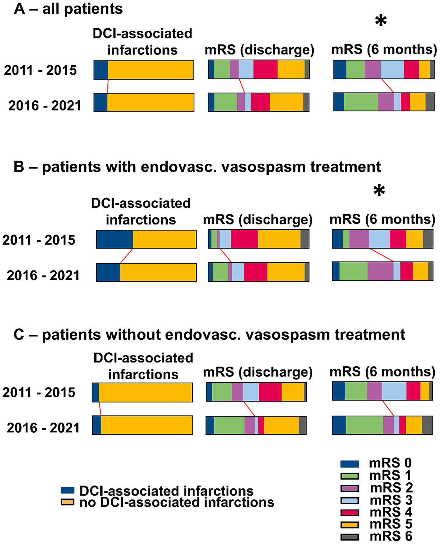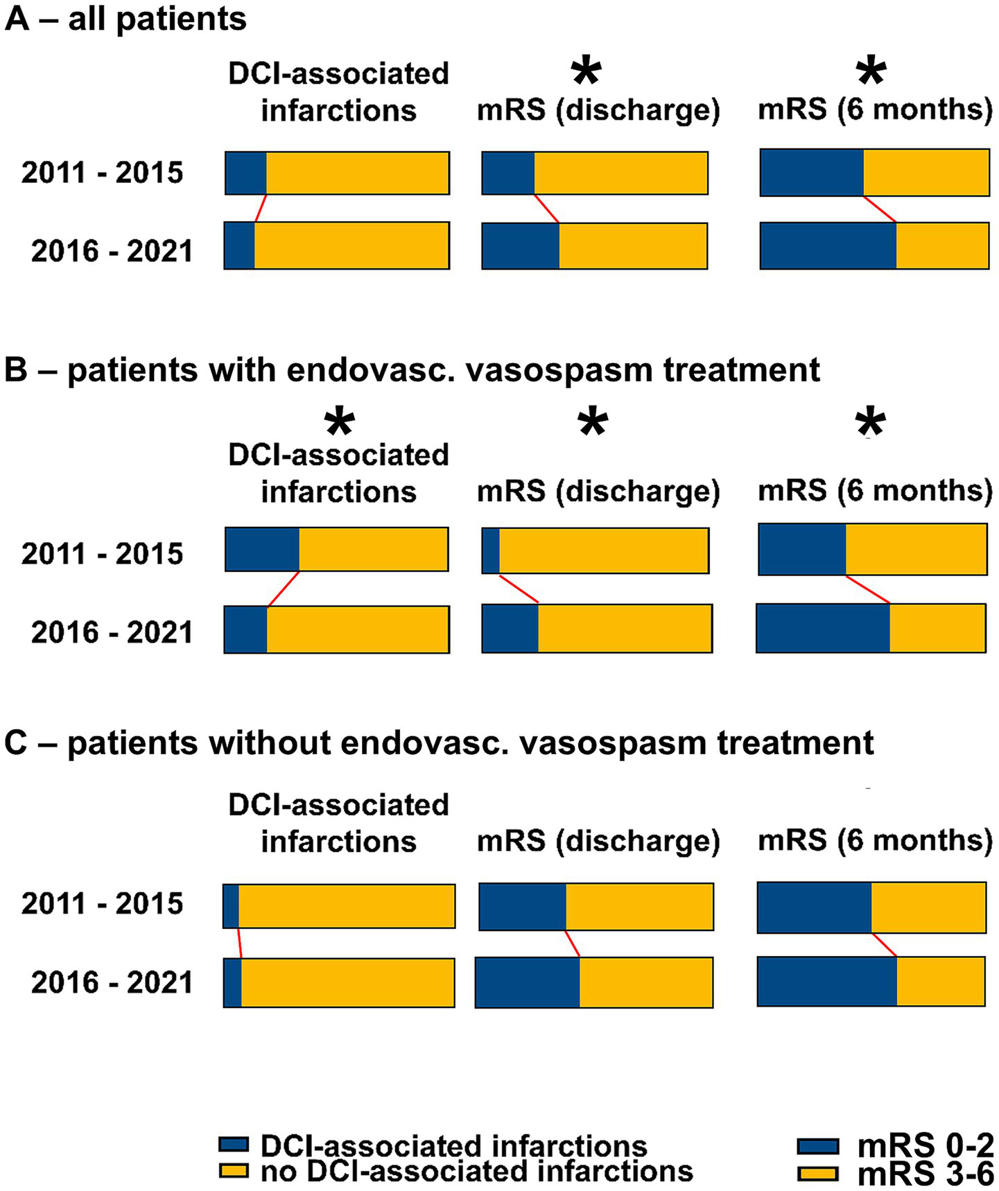 Outcomes in the cohorts before and after the introduction of ciaN. (A) All patients. (B) Patients with endovascular vasospasm treatments. (C) Patients without endovascular vasospasm treatments. *p < 0.05 (Fisher’s exact test).
