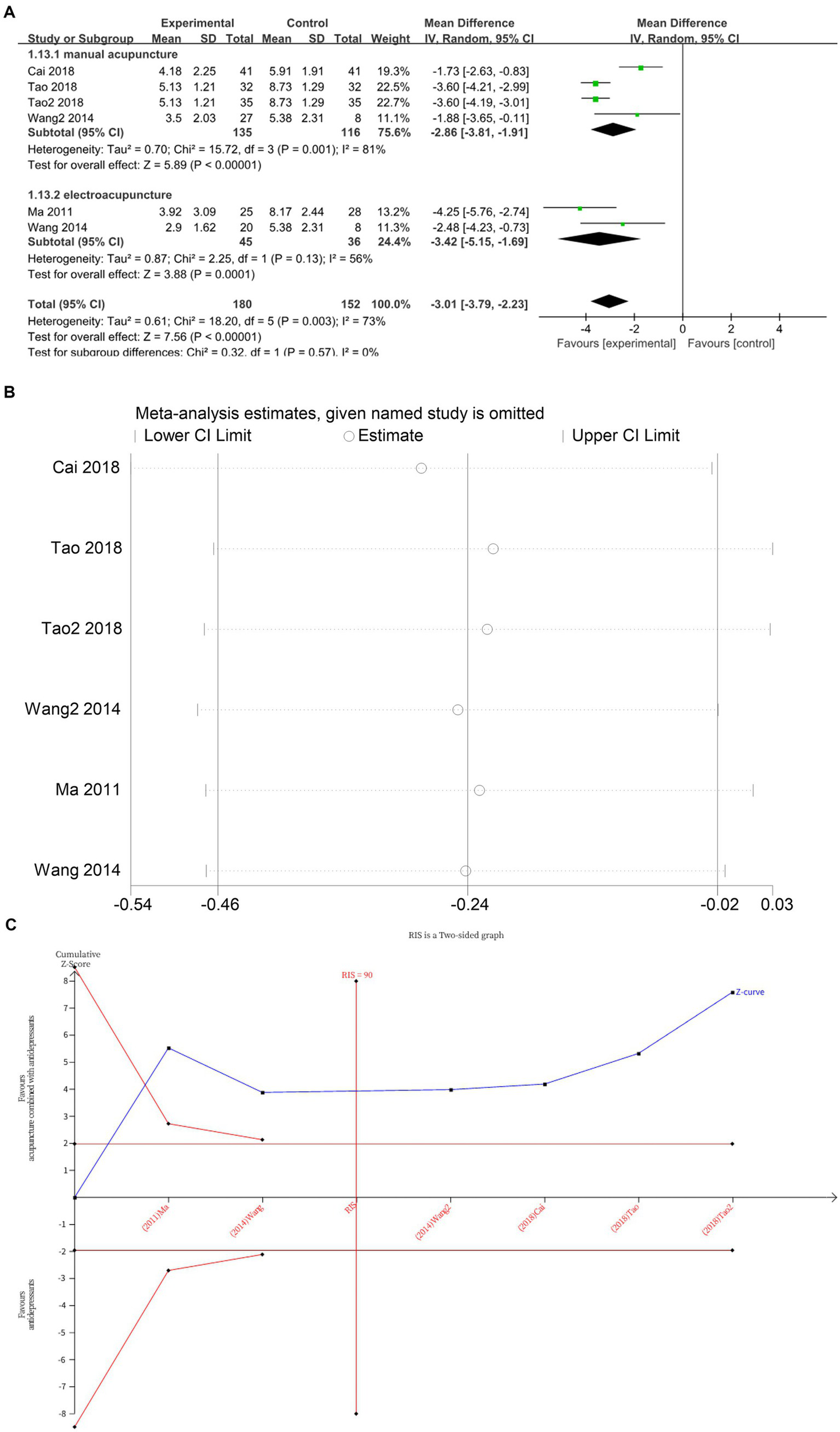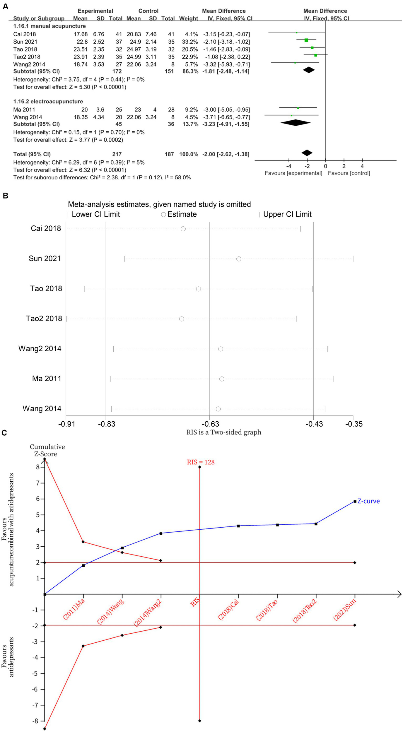 Five studies (12, 16, 21, 22) investigated changes in HAMD-17 before and after treatment, with a total of 326 subjects enrolled. The studies exhibited substantial heterogeneity (I2 = 67%, p = 0.02), which was analyzed using random effects modeling. Acupuncture combined with antidepressants demonstrated statistically significant improvement in patients’ depressive symptoms compared to antidepressants alone (MD = −2.80, 95%CI [−3.97, −1.62], p < 0.00001; Figure 4A). Sensitivity analysis confirmed the stability of the results (Figure 4B). Subgroup analysis according to acupuncture modality showed that manual acupuncture combined with antidepressants (MD = −2.03, 95%CI [−3.02, −1.04], p < 0.0001) and electroacupuncture combined with antidepressants (MD = −4.23, 95%CI [−5.91, −2.55], p < 0.00001) were superior to antidepressants alone in improving HAMD-17 scores (Figure 4A). The meta-regression analysis suggested that treatment frequency was a significant source of heterogeneity (p = 0.017). The TSA demonstrated that the cumulative Z-curve had crossed the RIS boundary (RIS = 120) for the improvement in HAMD-17 scores, indicating that the required sample size had been reached and the evidence was sufficient (Figure 4C).
