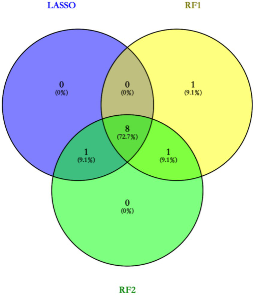 Based on the LASSO regression analysis, a total of 9 core targets were obtained at Lambda$1se, and random forests were used for variable screening using type1 and type2 to obtain the top 10 variables in the sorting, respectively, (Figure 1). The Venn diagram ultimately acquires eight core targets for machine learning: disease course, leukocytes, neutrophils, lymphocytes, monocytes, CRP, ferritin, and vitamin D deficiency (Figure 2).