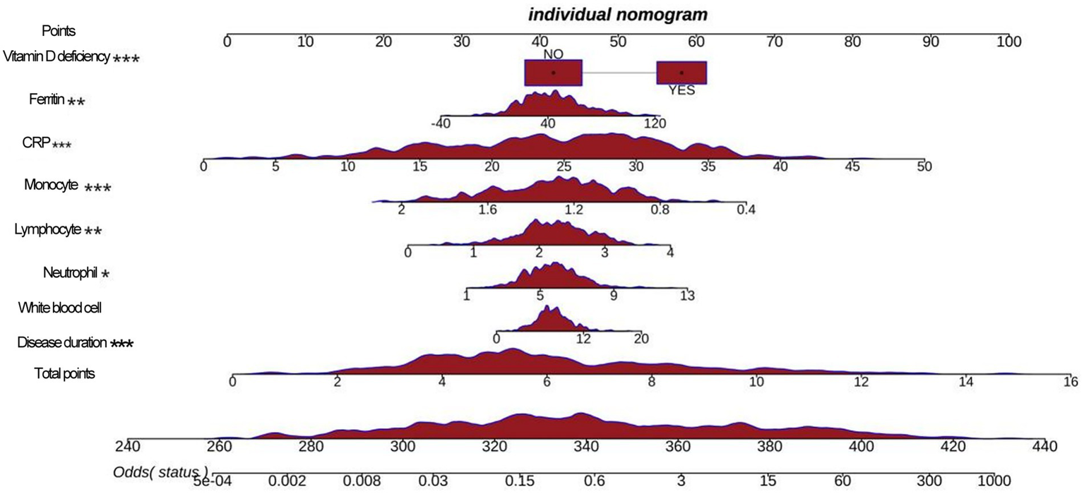 Based on machine learning, disease duration, white blood cell, neutrophils, lymphocytes, monocytes, CRP, ferritin, and vitamin D deficiency factors were finally obtained and included in the multifactorial logistic regression analysis (Table 3). The results showed that disease duration, leukocytes, neutrophils, lymphocytes, mono-CRP, ferritin, and vitamin D deficiency, were independent risk factors for the diagnosis of BPPV (OR>1, p < 0.05), and monocyte count was an independent protective factor for the diagnosis of BPPV (OR<1, p < 0.05). Based on multifactor logistic regression analysis, a prediction model was established as shown in Figures 3, 4.