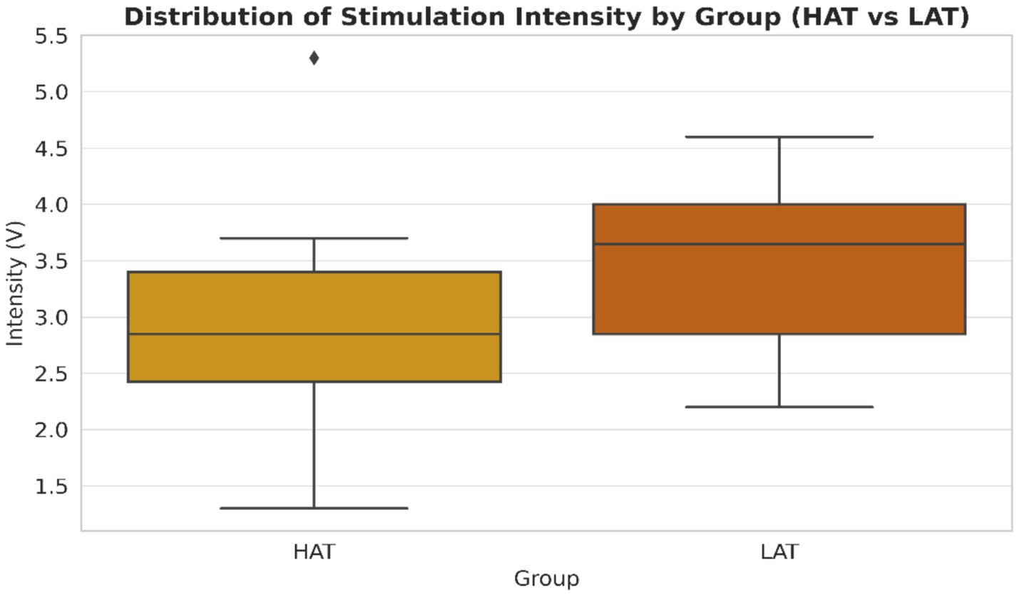 Figure 1 displays the distribution of stimulation intensity in both groups. The LAT group exhibited higher mean stimulation voltages (3.44 V) compared with the HAT group (2.9 V), with ranges of 2.2–4.6 V and 1.3–5.3 V, respectively. This trend recommends that lower-amplitude tremors require higher stimulation intensity. Physiologically, this could reflect more diffuse or complex neural network involvement in lower-amplitude tremors, requiring stronger modulation to maintain motor control (6). Higher stimulation may also target more distributed circuits, possibly involving the thalamus, globus pallidus, or subthalamic nucleus (STN), as DBS interrupts pathological oscillations driving tremor activity (19). Differences in tremor outcomes may also partly reflect the stimulation target rather than tremor pathophysiology alone; for example, VIM thalamic stimulation is generally more effective for tremor suppression than GPi or STN targets. Alternatively, voltage differences may reflect intrinsic properties of the targeted nucleus, as VIM, GPi, and STN differ in tissue impedance and stimulation spread.