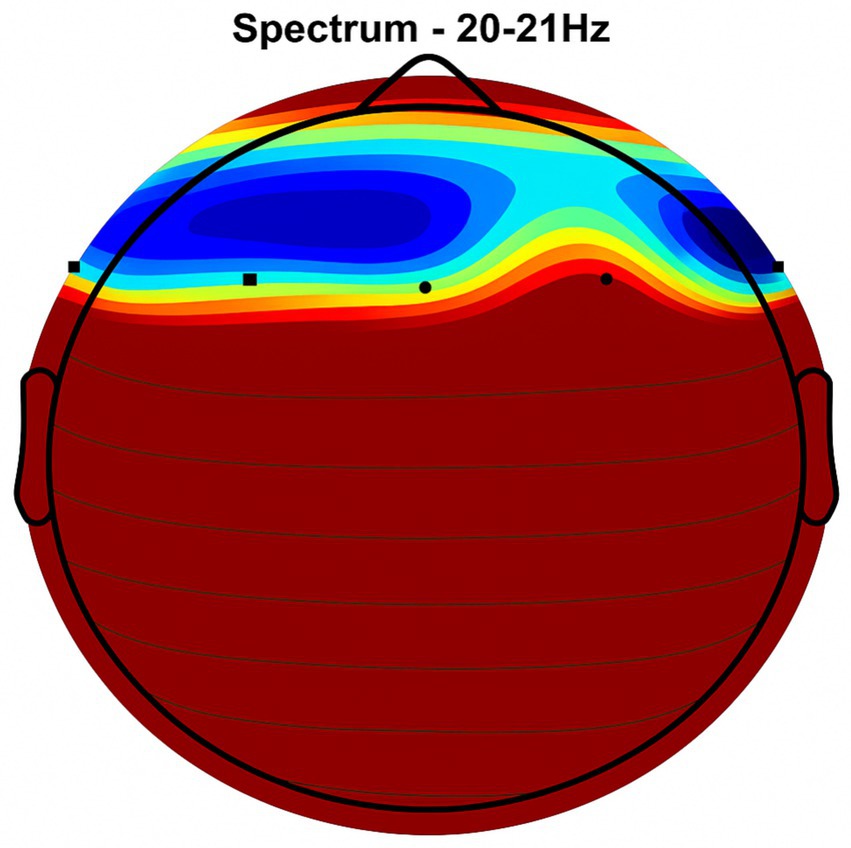 Figure 3. Frontal region activity with placebo. EEG coherence and power spectral density (PSD) in the frontal cortex (placebo group, n = 8). Mean ± SD PSD in the 9–12 Hz band: 6.1 ± 0.9 μV2/Hz. Activity is low with minimal coherence, suggesting reduced functional connectivity in regions critical for motor and cognitive control.