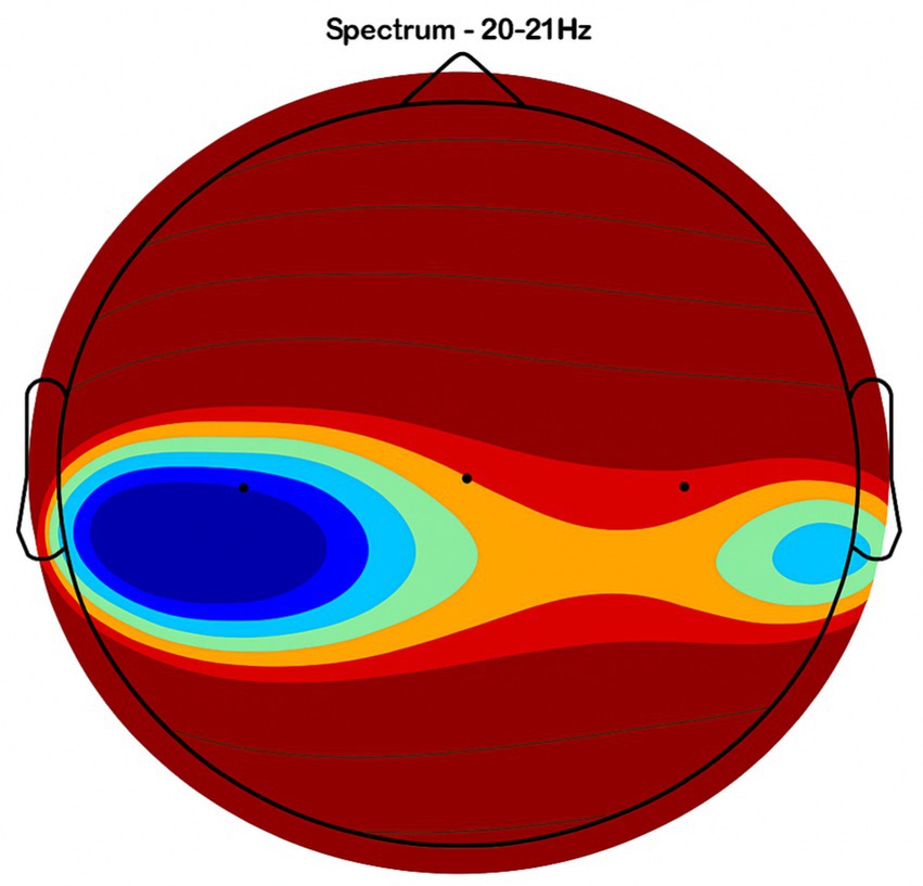 Figure 2. Topographic average activity in subjects receiving placebo treatment. EEG topographic map of mean neuronal activity in the placebo group (n = 8) at 9–12 Hz frequency band, averaged across frontal, central, and temporal regions. Coherence and intensity are low, indicating limited neuronal synchronization. Units: coherence (unitless), intensity (μV2/Hz). Color scale represents increasing activity from blue (low) to red (high).