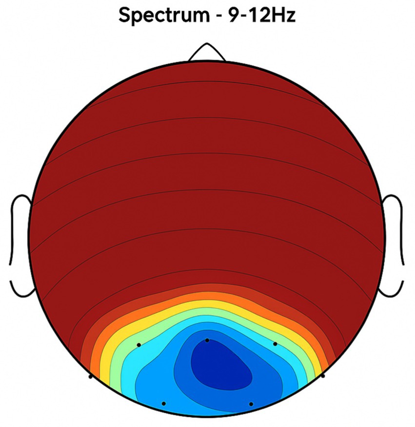 Figure 4. Central brain region activity in the placebo treatment. EEG coherence and power spectral density (PSD) in the central cortex (placebo group, n = 8). Mean ± SD PSD in the 9–12 Hz band: 6.3 ± 1.0 μV2/Hz. Low coherence and intensity reflect inadequate engagement of this motor coordination hub.