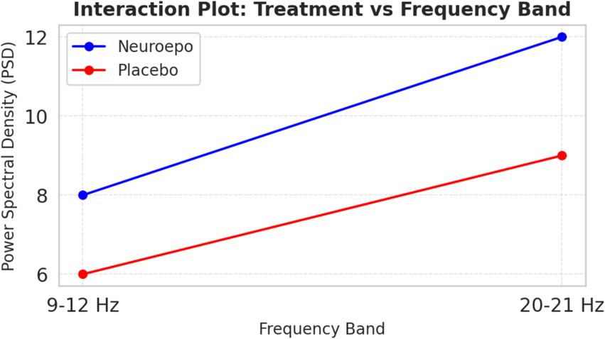 Figure 10 shows interaction effects between treatment and frequency bands. PSD increased markedly in the NeuroEpo group, especially in the 20–21 Hz band, compared to placebo. This suggests NeuroEpo exerts stronger effects on high-frequency oscillations important for motor and cognitive control (28). The consistent PSD increase across both frequency bands supports NeuroEpo’s potential to enhance overall brain activity, complementing DBS in complex tremor cases (19).