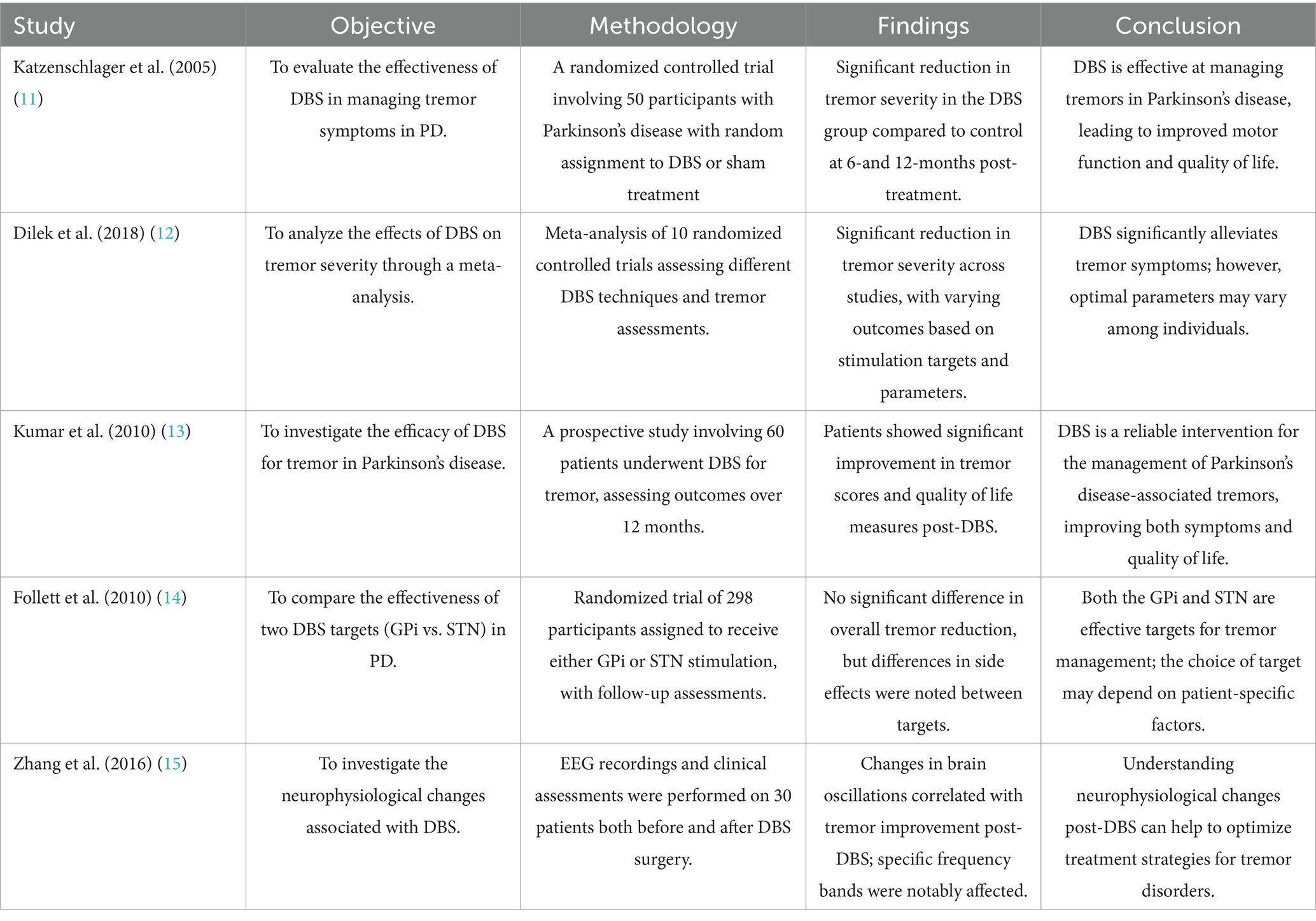 12. Katzenschlager, R, et al. The effect of deep brain stimulation on tremor in Parkinson’s disease: a controlled study. Mov Disord. (2005) 20:535–41. doi: 10.1002/mds.20382