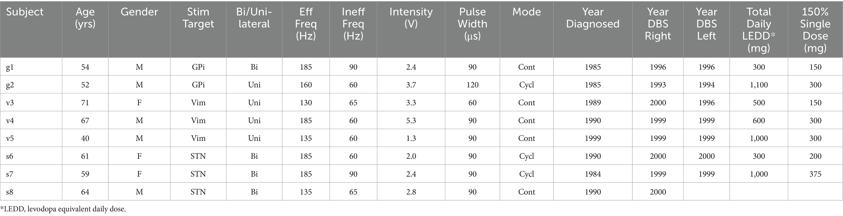 Collected data included age, sex, and disease duration (years since diagnosis). Clinical variables included stimulation target (GPi or Vim), stimulation parameters (effective and ineffective frequency, intensity, and pulse width), and medication dosage.