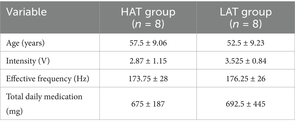 A total of 16 participants joined—8 in the HAT group and 8 in the LAT group. Tremor classification was based on peak-to-peak rest tremor amplitude recorded from the index finger: > 4 mm was categorized as HAT, and ≤4 mm as LAT (18). Recordings were taken under conditions with and without DBS and medication.