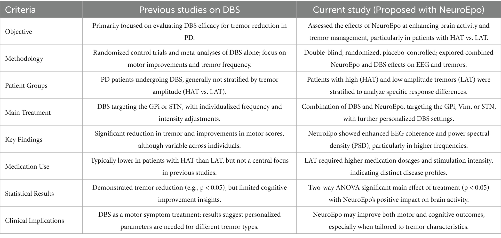 Table 5. Comparison of prior DBS studies with proposed combined NeuroEpo and DBS treatment for Parkinson’s disease tremor management.