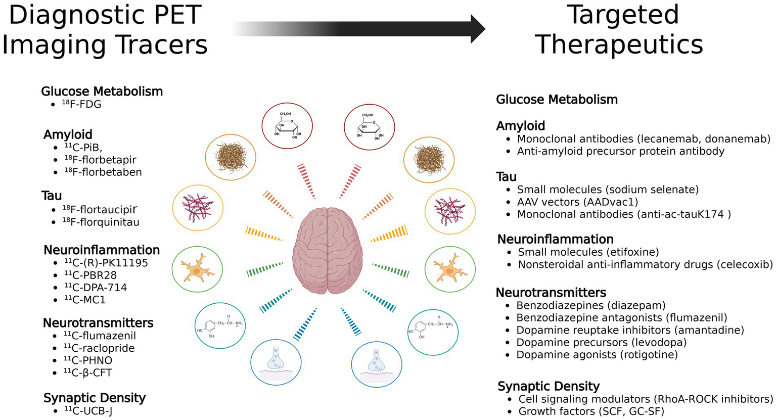 Here, we will briefly review the major classes of PET biomarkers discussed in this review and explore their potential roles as neurotheranostic tools when paired with existing or emerging therapies for TBI. While most therapeutic strategies remain in early development or are adapted from other disease contexts, such as AD, we summarize the current state of research investigating their application in TBI and highlight opportunities for future therapeutic pairing and clinical translation.