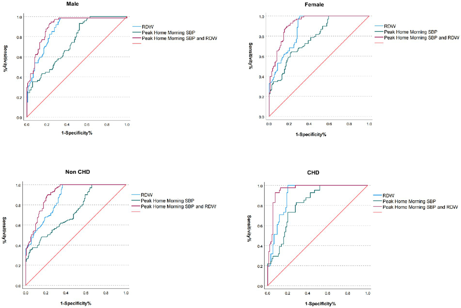 Both RDW and peak morning home SBP emerged as independent risk factors for PSCI (OR = 70.95 and 1.104, respectively; p < 0.001 for both). The combined model significantly improved predictive performance, achieving an area under the curve (AUC) of 0.925 (95% CI: 0.901–0.948), surpassing individual biomarkers (RDW: AUC = 0.883; peak morning home SBP: AUC = 0.765). Subgroup analyses demonstrated superior discriminative capacity in coronary heart disease (AUC = 0.956) and female patients (AUC = 0.925).