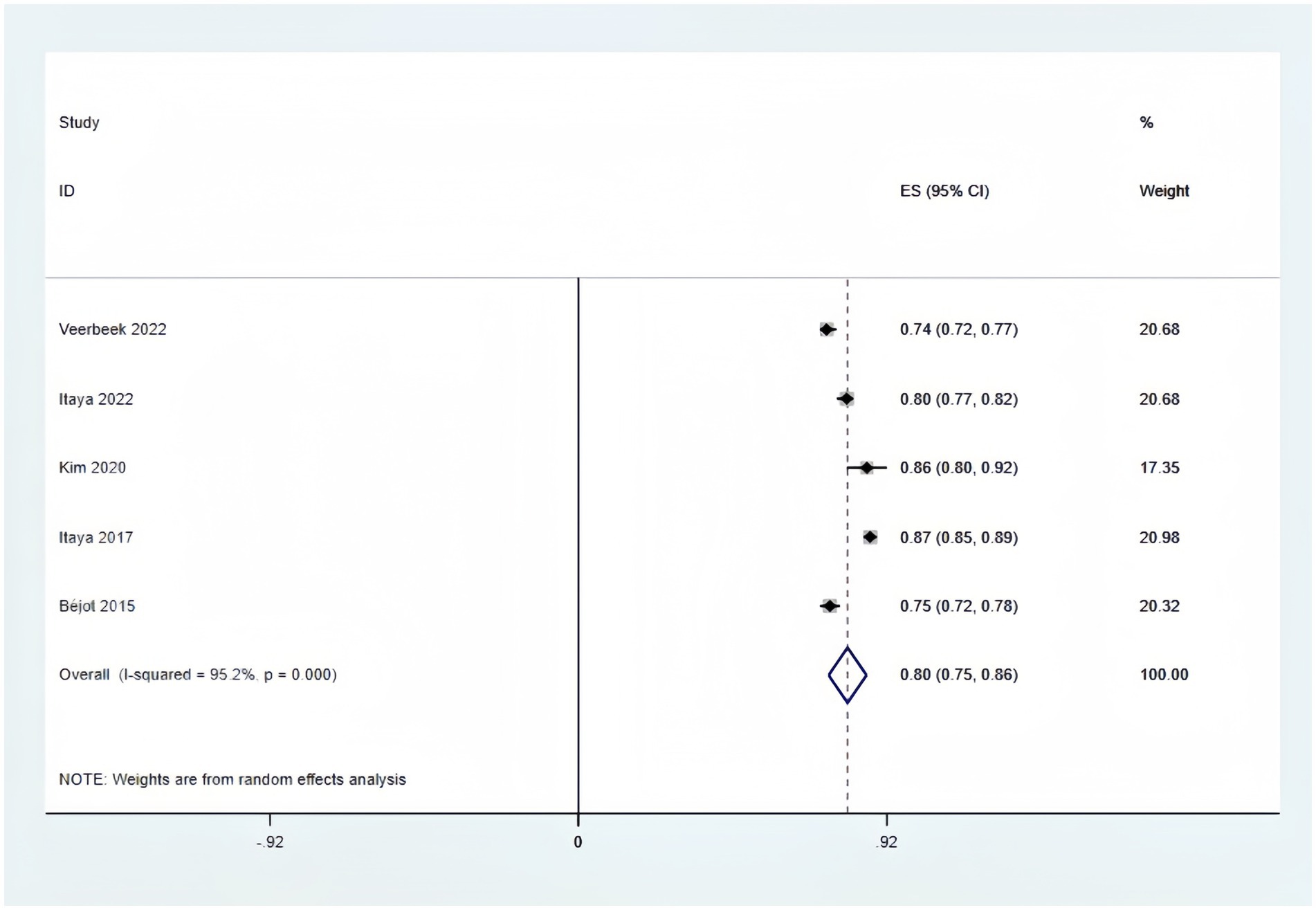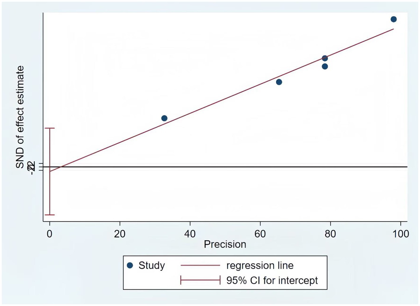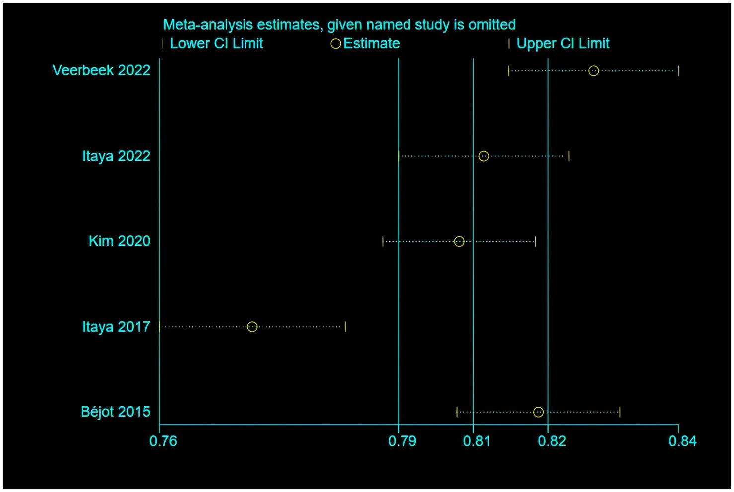 Only five of the listed papers were suitable for synthesis because of inadequate reporting on the model development specifics. The validation model used a random effects model to calculate the combined AUC, which was 0.80 (95% CI [0.75–0.86]), indicating good overall predictive performance (Figure 3). The heterogeneity test revealed significant heterogeneity (p < 0.001, I2 = 95.2%), and a random effects model was used. Changes in study design, sample size, predictor selection, and outcome definition may be the cause of the significant variability among studies. The findings’ robustness was demonstrated by the results’ stability even after any one study was eliminated. In addition, the sensitivity analysis confirmed the robustness of the results, with no single study altering the magnitude of the combined effect (Figure 4). The Egger’s test indicated no significant asymmetry (p = 0.757) (Figure 5). The funnel plot showed a roughly symmetrical distribution of the scatter points around the pooled effect size, with all points falling within the pseudo 95% confidence limits (Supplementary Figure 1), suggesting a low likelihood of publication bias. The meta-regression analysis identified the country of the participants (p = 0.5235), to be not a significant source of the heterogeneity.