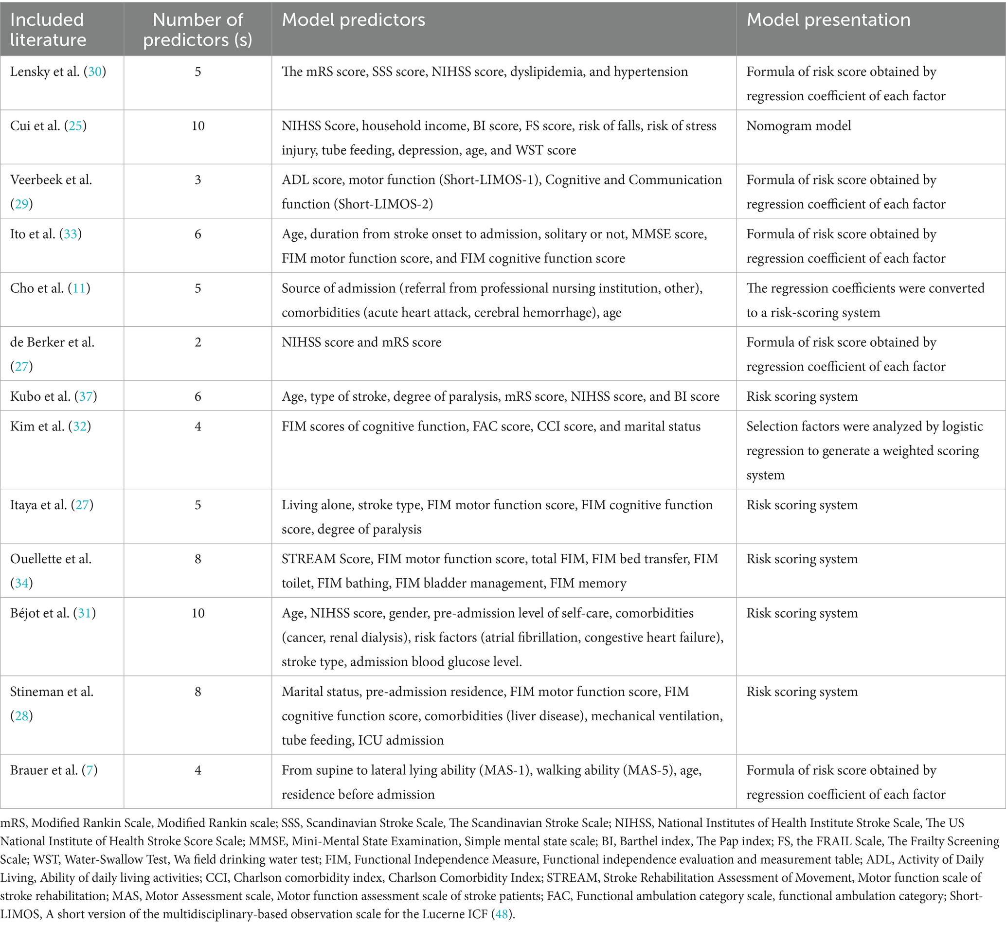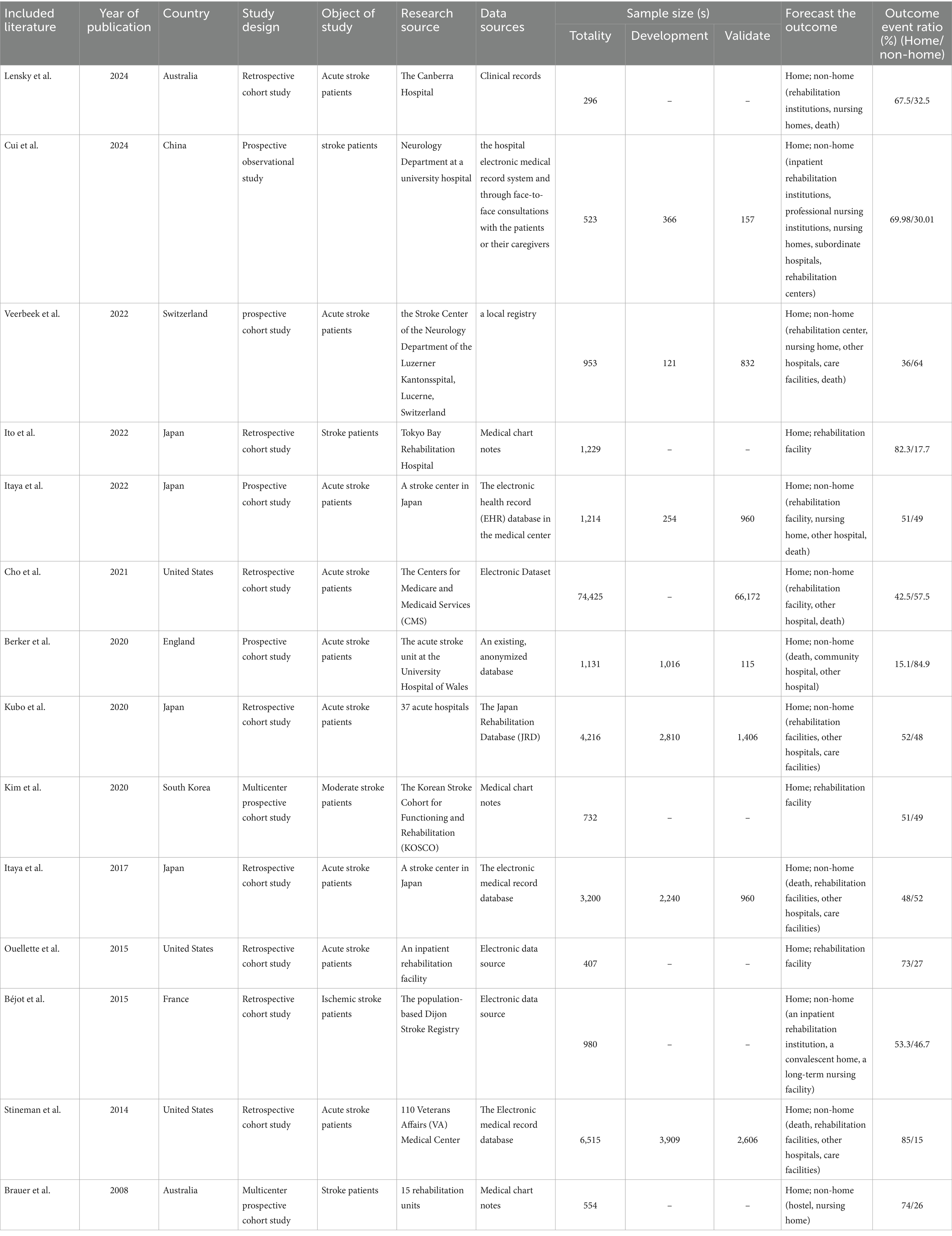 The inclusion criteria were: (1) Study subjects: Conforms to the diagnostic standards for stroke guidelines for therapy established by the Neurology Branch of the Chinese Medical Association (17), MRI or CT scans were used to diagnose stroke; aged ≥18 years; (2) Study types: include cohort studies, cross-sectional studies, and case–control studies; (3) Study content: focused on the construction and validation of risk prediction models for discharge disposition in stroke patients; (4) Predict the outcome: discharge to home or non-home setting; (5) Language type: Chinese or English textual form.