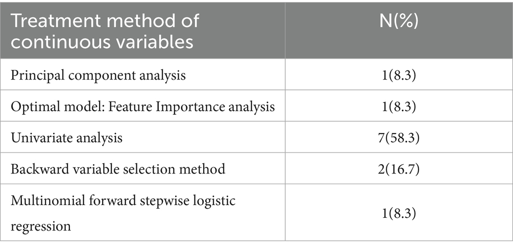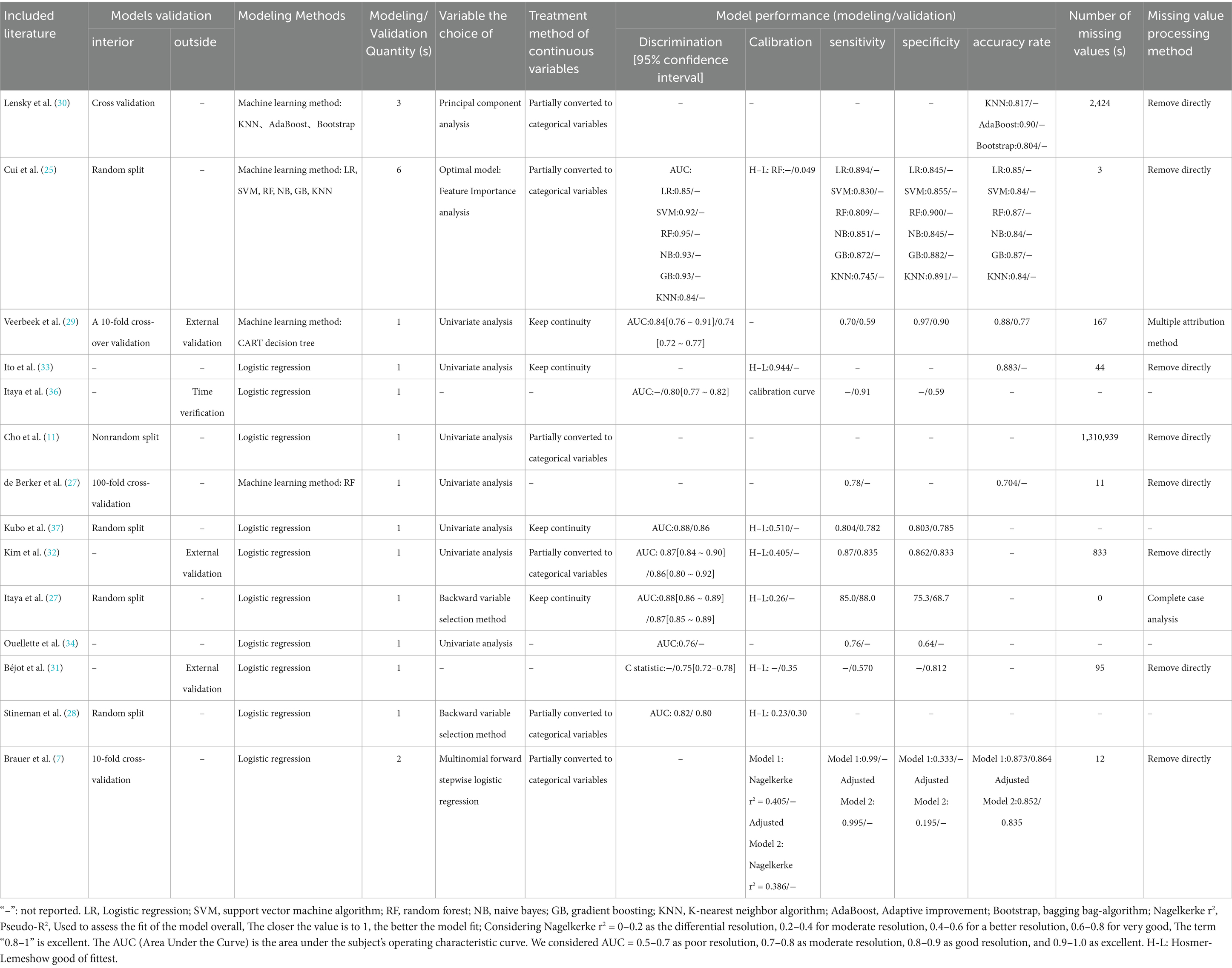 All 14 studies were judged to have a high risk of bias in the analytical domain. Five of these studies lacked sufficient sample size for validation or modeling (7, 11, 29, 32, 34). For modeling studies, the number of EPV should be greater than 20 for each variable to avoid over-fitting of the model; for model validation studies, at least 100 subjects with outcome events should be included (35). Four studies lacked detailed information on participant follow-up, withdrawal, or study termination, and how missing data were handled (28, 34, 36, 37),six studies directly deleted subjects with missing values, without adopting the complete case analysis method to reduce bias (7, 11, 25, 31–33). Continuous variables were transformed into categorical variables in six studies (7, 11, 25, 26, 28, 32), which led to a substantial loss of information and even diminished the model’s capacity for prediction. Five research failed to thoroughly evaluate their prediction models’ predictive capabilities (7, 11, 26, 30, 33). Four studies used the randomized split-validation method (25, 28, 36, 37), and one did not specify the exact validation method (11). Details are provided in Supplementary Table S2.