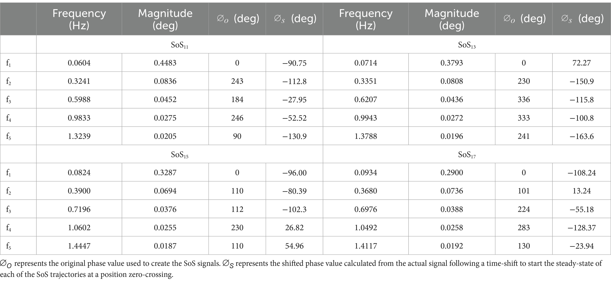 We shifted the signals in time to begin motion at a displacement zero-crossing to minimize transients that otherwise might unduly perturb subjects at the beginning of the trial. Table 1 shows the original phase as well as the shifted phase values of SoS11, SoS13, SoS15, and SoS17 at each individual frequency.