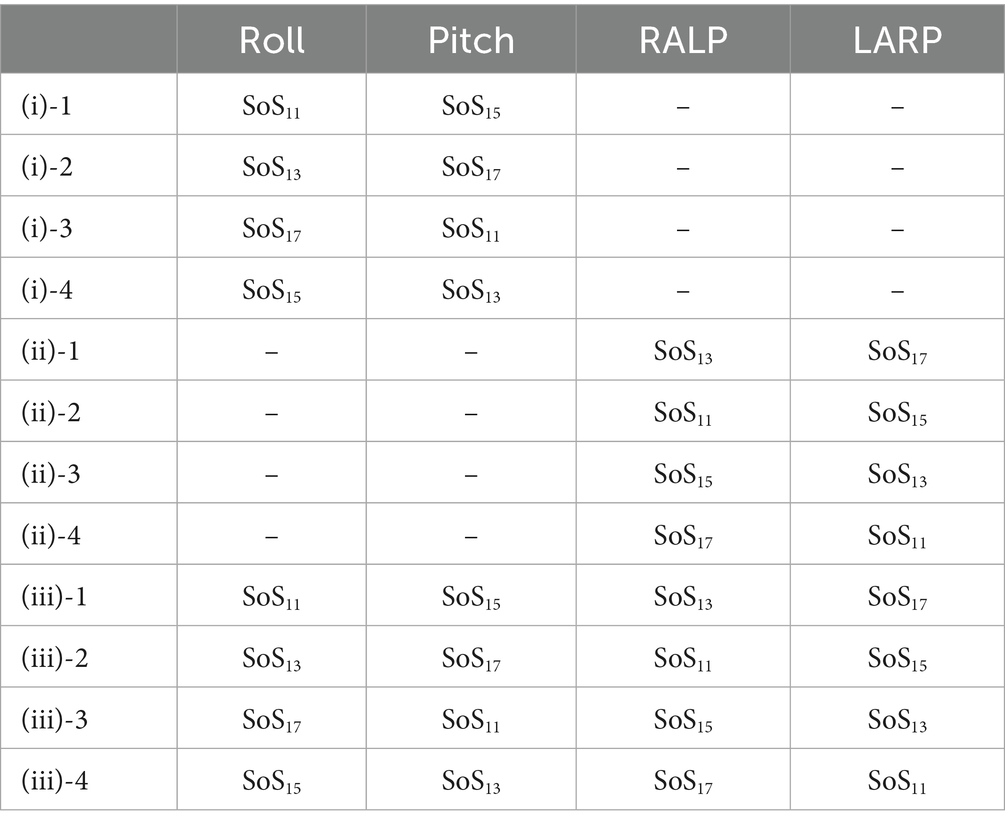 Figure 6 shows the average ML, AP, RALP, and LARP CoP sway spectral magnitude across the 24 subjects for RALP/LARP condition (iii)-1 (i.e., when SoS11 was provided for roll, SoS15 was provided for pitch, SoS13 was provided for RALP, and SoS17 was provided for LARP). ML spectral peaks were observed at each of the roll, RALP, and LARP perturbation frequencies (Figure 6A); AP spectral peaks were observed at each of the pitch, RALP, and LARP perturbation frequencies (Figure 6B). Similarly, RALP spectral peaks were observed at each of the RALP, roll, and pitch perturbation frequencies (Figure 6C); LARP spectral peaks were observed at each of the LARP, roll, and pitch perturbation frequencies (Figure 6D). Each CoP spectral magnitude shows 15 response components at three sets of five perturbation frequencies in the directions described above. This demonstrates that spectral postural response components were observed at each perturbation frequency—except for responses that were spatially orthogonal to the stimuli (e.g., AP responses to roll stimuli or RALP responses to LARP stimuli)—when four SoS perturbations are provided in roll, pitch, RALP, and LARP directions simultaneously.