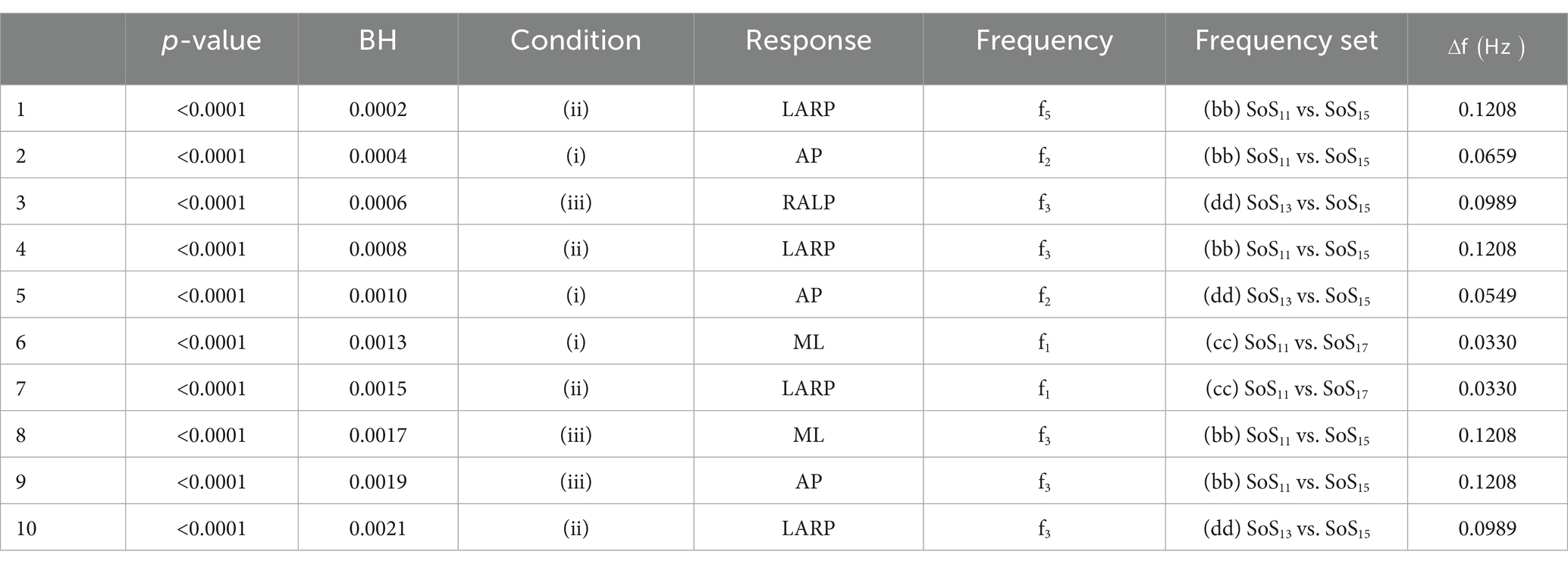Analogous to earlier analyses, 240 comparisons were performed using Hotelling’s T-squared test to investigate how those four specific frequency sets (SoS11, SoS 13, SoS 15, and SoS 17) and their five frequencies (f1 through f5) affect ML, AP, RALP, and LARP CoP sway. After calculating the discrete Fourier transform, we took the vector difference between the real and imaginary components of the two spectra for each stimulation frequency for each participant and performed a Hotelling’s T-square test to compare CoP in response to (aa) SoS11 and SoS13, (bb) SoS11 and SoS15, (cc) SoS11 and SoS17, (dd) SoS13 and SoS15, (ee) SoS13 and SoS17, and (ff) SoS15 and SoS17. This yielded 60 comparisons (each of 6 SoS stimuli comparisons x each of 5 frequencies x each of 2 response directions) for (i) roll/pitch only, 60 comparisons for (ii) RALP/LARP only, and 120 comparisons for (iii) roll/pitch/RALP/LARP (each of 6 SoS stimuli comparisons x each of 5 frequencies x each of 4 response directions), which means 240 comparisons in total. Hotelling’s T-squared test found 168 significant differences. Bonferroni correction yielded 75 significant differences, which is 31.25% of the p-values, and the B-H procedure yielded 145 significant differences, which is 60.41% of the p-values. Table 5 shows the 10 lowest original p-values and the individual p-values’ BH critical values. Specifically, we found that small frequency shifts between (aa) SoS11 and SoS13, (bb) SoS11 and SoS15, (cc) SoS11 and SoS17, (dd) SoS13 and SoS15, (ee) SoS13 and SoS17, and (ff) SoS15 and SoS17 yielded significant differences in postural responses.