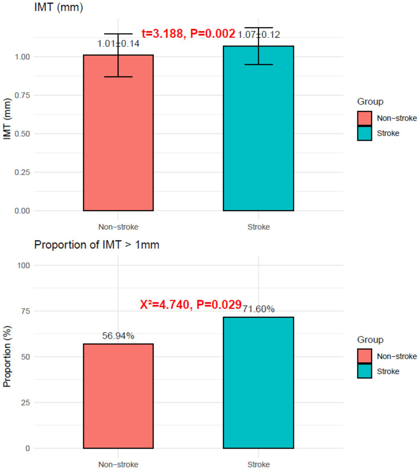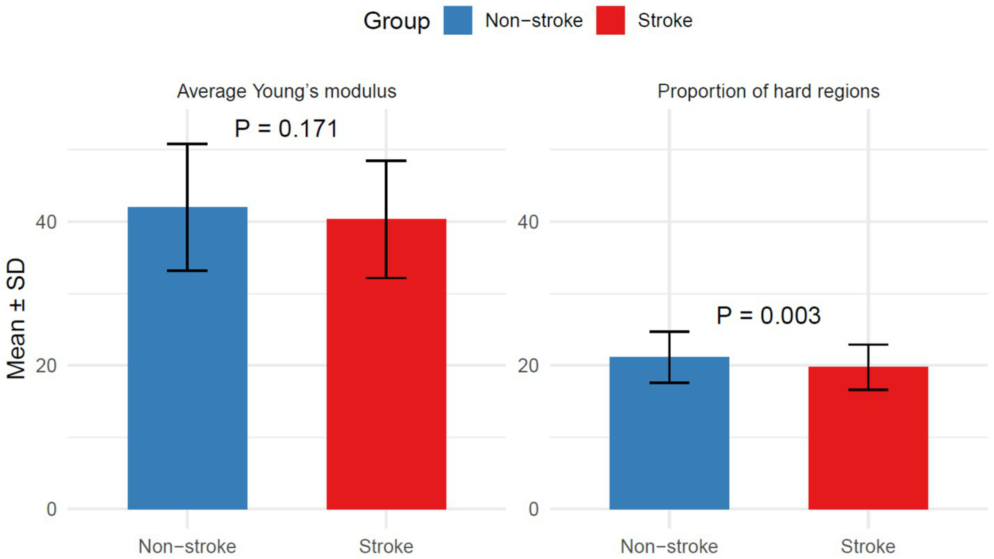 This retrospective cohort study evaluated 225 patients (≥18 years) with carotid plaques identified by Doppler ultrasound at a tertiary hospital between January 2022 and December 2024. Patients were followed for 1 year and grouped by stroke outcomes. Baseline demographics, laboratory data, medication use, plaque characteristics (echogenicity, anatomical location, length, thickness, surface morphology, calcification, and intraplaque hemorrhage), intima-media thickness (IMT), neovascularization (graded by contrast-enhanced ultrasound), and plaque hardness (quantified by elastography) were analyzed.