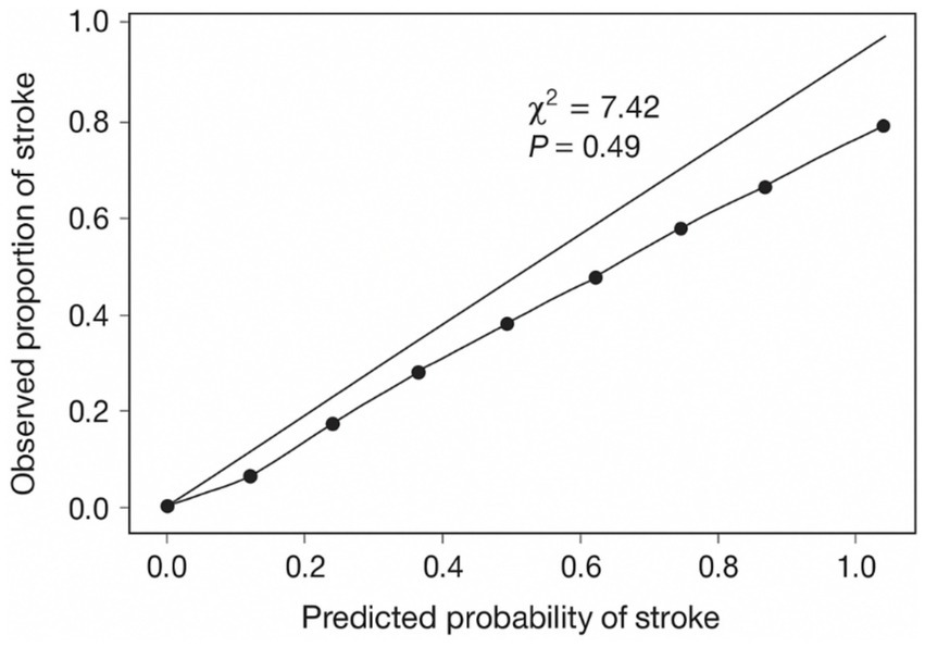 Baseline characteristics were analyzed by comparing groups with and without stroke, as shown in Table 1. Overall, the groups were similar in age, sex, BMI, waist circumference, and other lifestyle factors and comorbidities. The prevalence of prior cerebrovascular events was higher in the stroke group (18.52% vs. 8.33%, χ2 = 5.132, p = 0.023), indicating that prior cerebrovascular disease may contribute to increased stroke risk.