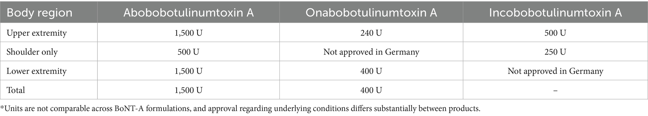 Table 1. Maximum dosage of BoNT-A in adult spasticity, U, units*.