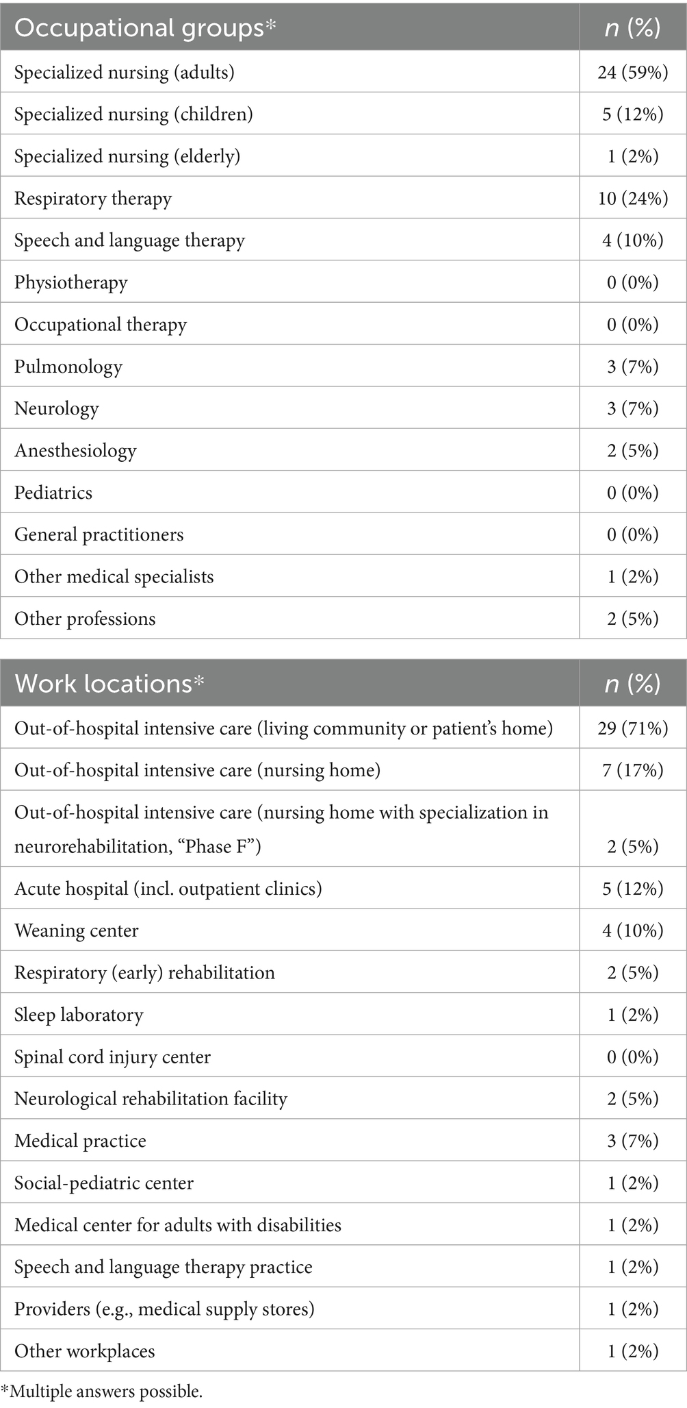 Methods: An online questionnaire with 10 questions was developed by the German Interdisciplinary Society for Out-of-Hospital Ventilation and Intensive Care (DIGAB). The survey was distributed via the mailing lists of the DIGAB, the German Society for Respiratory Therapy, and the nursing supervisors of the Deutsche Fachpflege nursing service, as well as to speech and language therapists through a private mailing list.