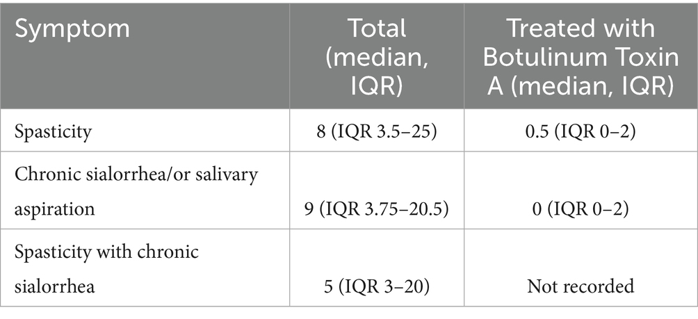 The effectiveness of BoNT-A in treating spasticity and sialorrhea in children and adults has been demonstrated in randomized placebo-controlled trials (9–12). BoNT-A has the potential to reduce pain, improve patient comfort, facilitate daily care routines, and enhance long-term care and rehabilitation outcomes, and it may help to reduce aspiration pneumonia in cases of salivary aspiration (13). A multimodal approach and adjunctive therapies are both used to enhance the treatment effect of BoNT-A in spasticity (14). BoNT-A is also regarded as a first-line treatment for cranial or cervical dystonia (15). Neutralizing antibodies may reduce the efficacy and lead to secondary treatment failure, and they are reported in patients treated with abobotolinumtoxin A and onabotulinumtoxin A, but not in patients treated only with incobotulinumtoxin A (16). The most relevant side effects of BoNT-A in patients receiving out-of-hospital intensive care are dysphagia and respiratory symptoms (17, 18). Although high doses carry a risk of iatrogenic botulism (19), the safe administration of doses up to 1,200 MU has been demonstrated for incobotulinumtoxin A, supporting its use in severe, widespread spasticity in out-of-hospital intensive care (20).