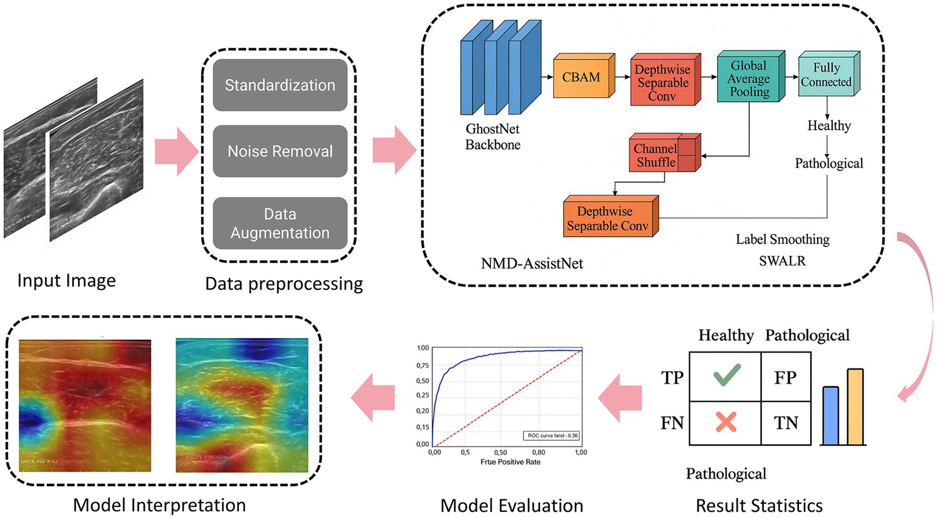 To address the aforementioned challenges, this paper proposes NMD-AssistNet, a novel lightweight deep learning model for the efficient and automated classification of neuromuscular diseases from ultrasound images. Based on the GhostNet architecture (11), this model introduces the CBAM (Convolutional Block Attention Module) that integrates channel attention and spatial attention to enhance the feature focusing ability of key lesion areas. At the same time, it combines depthwise separable convolution and a channel shuffling mechanism to significantly reduce the number of model parameters and computational complexity, thereby adapting to the characteristics of complex texture details and blurred boundaries in ultrasound images. In addition, in order to improve the generalization ability and training stability of the model, we also introduced the Mixup data enhancement strategy, label smoothing regularization, and SWALR (Stochastic Weight Averaging with Learning Rate Scheduling). The experimental part is based on a real clinical ultrasound image dataset, and systematically compares its performance with multiple mainstream models on multiple classification performance indicators, and analyzes its diagnostic accuracy and clinical interpretability through attention heat maps (Figure 1).