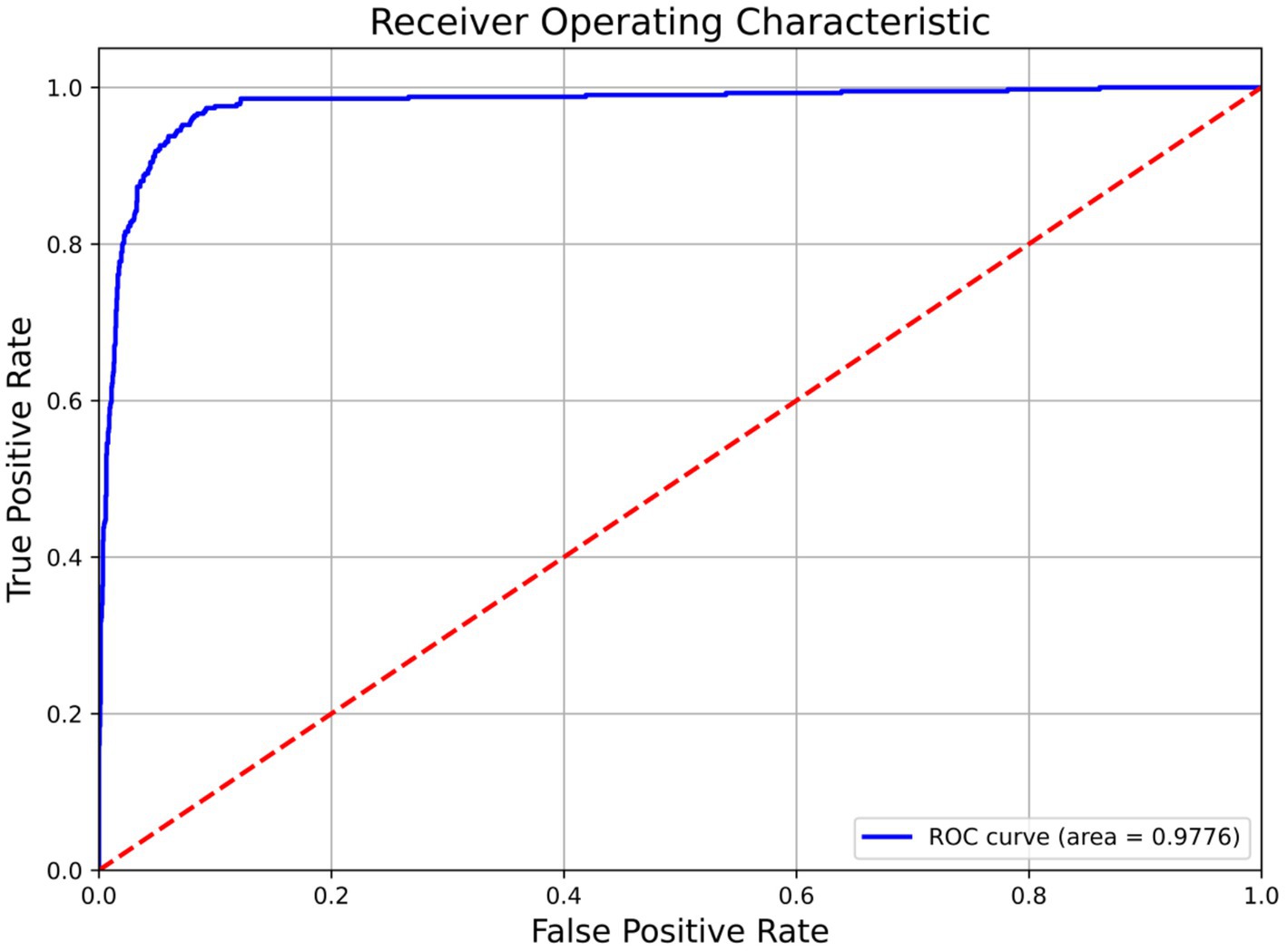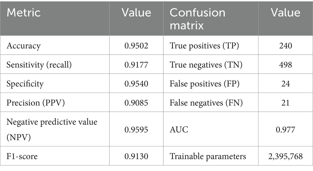 NMD-AssistNet achieved high performance across all evaluated metrics (Table 2). The model correctly classified 738 out of 783 total samples, with the full confusion matrix detailed in Table 2. Figure 2 shows the receiver operating characteristic (ROC) curve for NMD-AssistNet, which is positioned close to the upper-left corner with an AUC value of 0.9776.