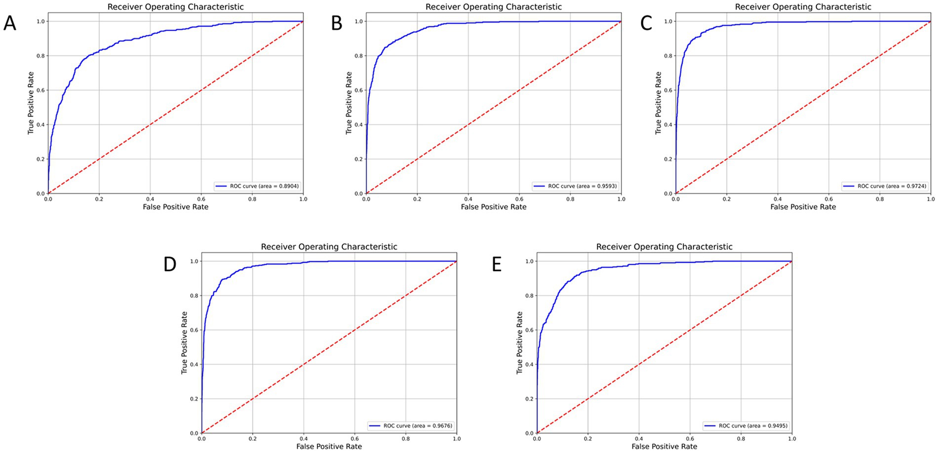 Figure 5. ROC curve and AUC comparison among models on the validation set. NMD-AssistNet achieved the highest AUC (0.9776), outperforming CSPNet (A, 0.8904), EfficientNet (B, 0.9593), GhostNet (C, 0.9724), HRNet (D, 0.9676), and ViT (E, 0.9495).