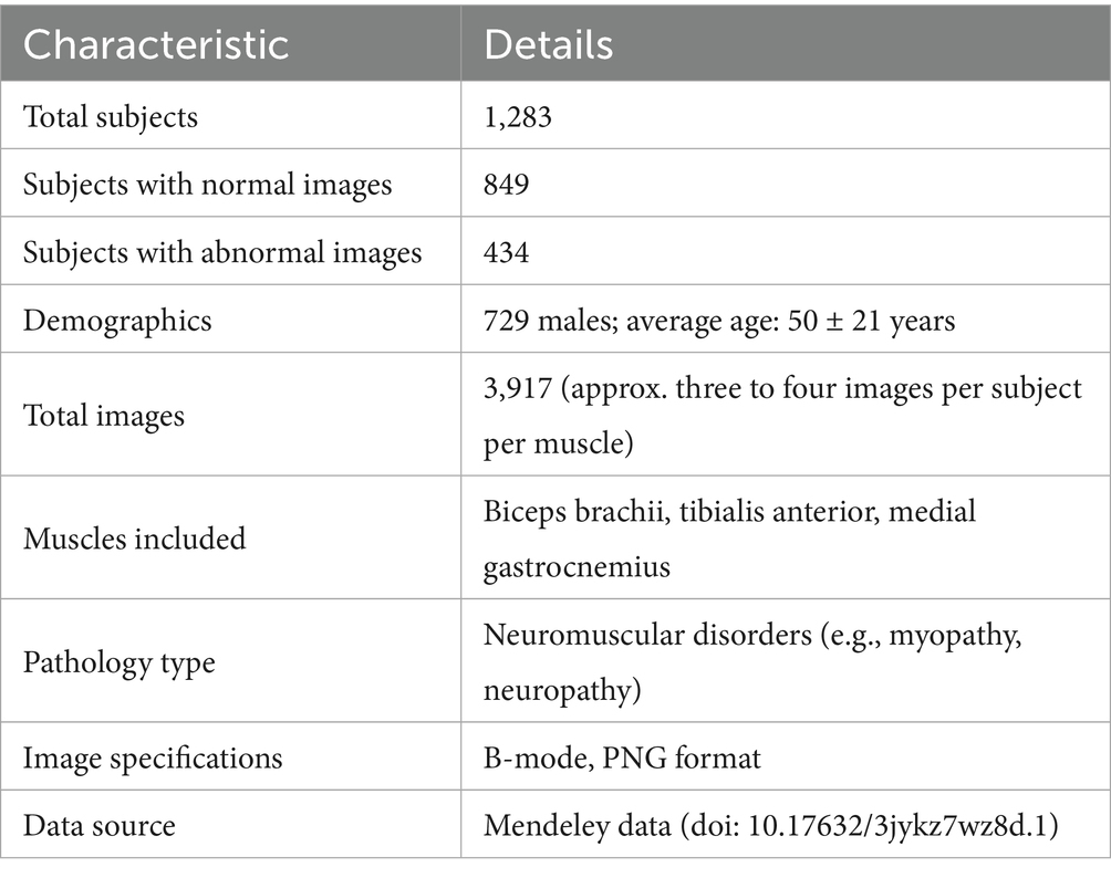 This study utilized a public ultrasound image dataset from the Mendeley data repository (DOI: 10.17632/3jykz7wz8d.1), originally collected in the Arnhem-Nijmegen region. The dataset is governed by the Creative Commons Attribution 4.0 (CC BY 4.0) license, which explicitly permits data reuse for any research purpose with proper citation, thus no separate institutional review board approval was required for our secondary analysis (12). The dataset contains data from a total of 1,283 subjects (average age 50 ± 21 years, 729 males), including 3,917 cross-sectional ultrasound images, covering three common skeletal muscle groups: biceps brachii, tibialis anterior, and medial gastrocnemius. All images were manually annotated by experienced clinical ultrasound experts to ensure the accuracy of anatomical structure identification and classification labels (13). To classify muscle images into healthy and pathological categories, the original research team used a z-score method based on grayscale values. The z-score was calculated using linear regression models derived from a healthy population, incorporating variables such as age, gender, and BMI. An image was labeled as “abnormal” if its grayscale value z-score was greater than 2, and “normal” otherwise. This classification resulted in the following distribution per muscle group: biceps brachii (287 normal, 158 abnormal subjects), medial gastrocnemius (266 normal, 110 abnormal subjects), and tibialis anterior (296 normal, 166 abnormal subjects). In total, the dataset comprises images from 849 normal and 434 abnormal subjects (Table 1 and Supplementary Table S1).