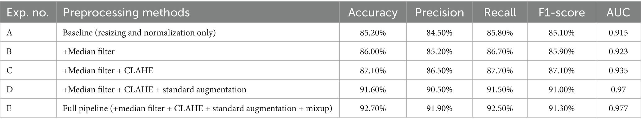 An ablation study was conducted to validate the effectiveness of each component in the data preprocessing pipeline. As detailed in Table 3, each added step incrementally improved model performance. The inclusion of standard data augmentation (Exp. D) yielded the most substantial increase in F1-score, while the complete pipeline with Mixup (Exp. E) achieved the highest scores across all metrics.