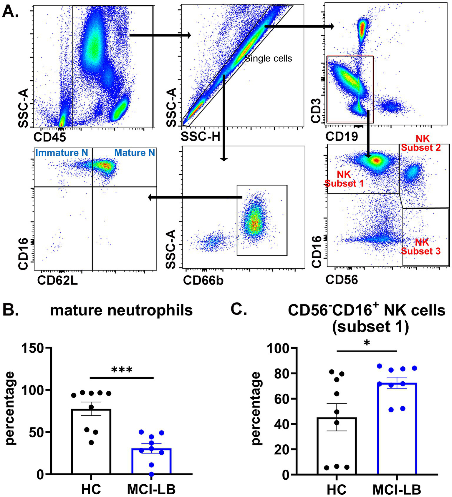 Demographics and medical history were comparable between groups. Significant differences in University of Pennsylvania Smell Identification Test, Schwab and England Activities of Daily Living, and MDS-UPDRS scores were observed between the groups. MCI-LB subjects had poorer cognitive composite scores compared to PD participants. MCI-LB subjects demonstrated a robust 60% reduction in mature neutrophils compared to healthy controls.