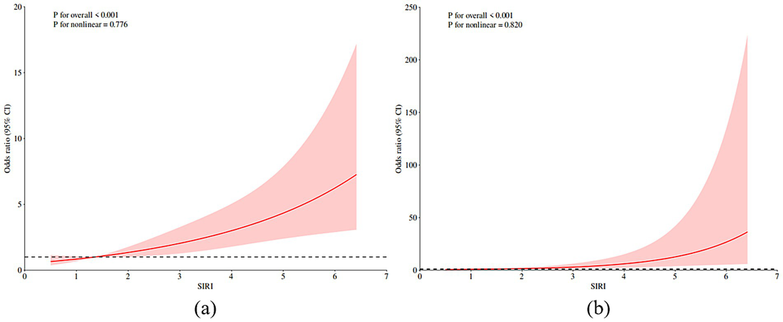 The baseline SIRI level in the PSE group was significantly higher than that in the non-PSE group (3.43 ± 2.74 vs. 1.79 ± 1.40, p < 0.001). Stratified analysis showed that there was a significant interaction between SIRI and PSE in the subgroup with underlying diseases (p < 0.001). The RCS analysis also suggested that there was a nonlinear positive correlation between SIRI and PSE risk (p = 0.382), and the risk inflection point appeared when SIRI = 1.36.