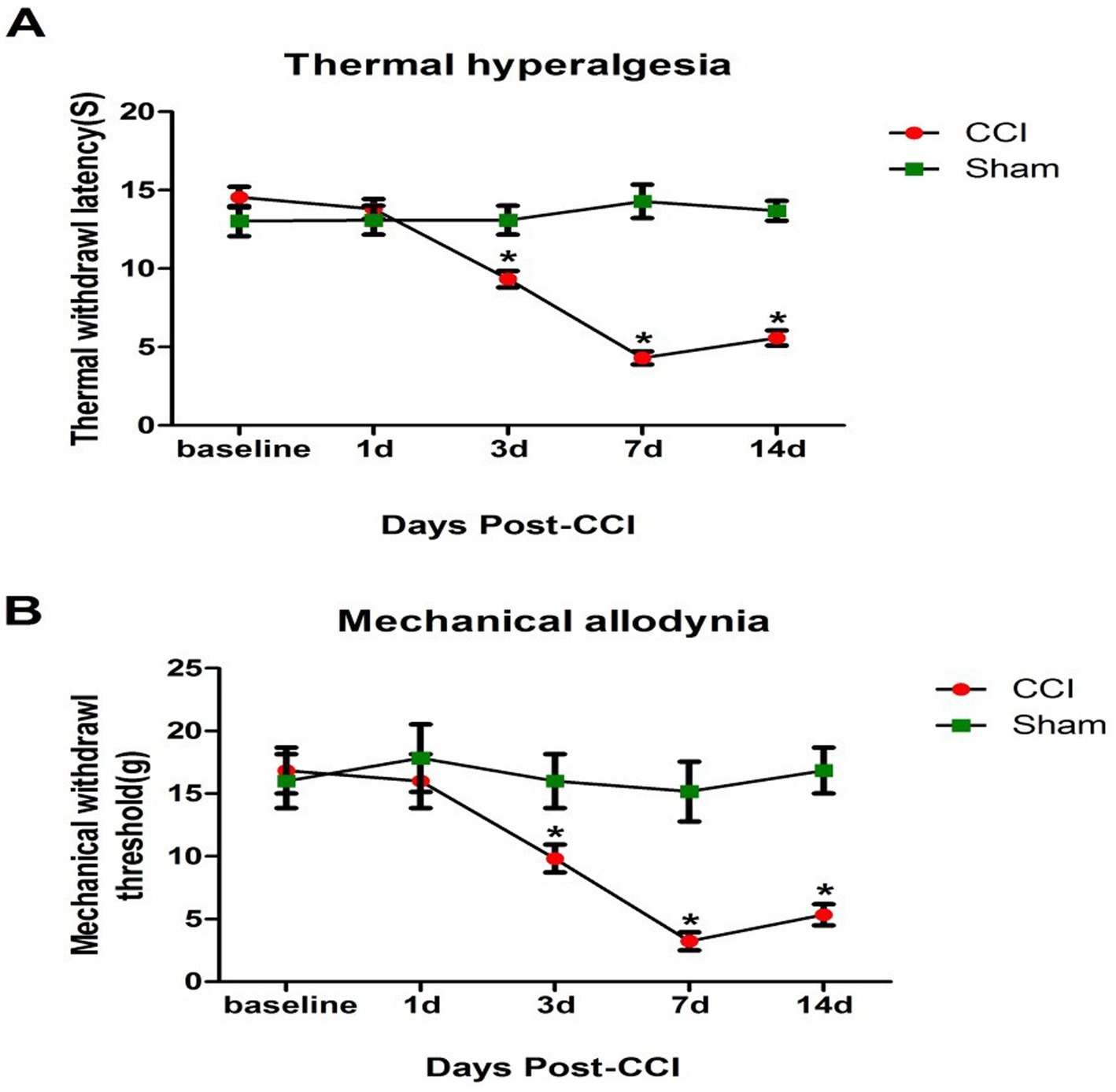 Graph A shows thermal hyperalgesia with CCI group latency decreasing from baseline to day three and increasing by day fourteen, while the Sham group remains stable. Graph B depicts mechanical allodynia where CCI threshold decreases significantly by day three and stabilizes by day fourteen; Sham remains unchanged. Both graphs indicate statistical significance at days three and seven for CCI, denoted by asterisks.