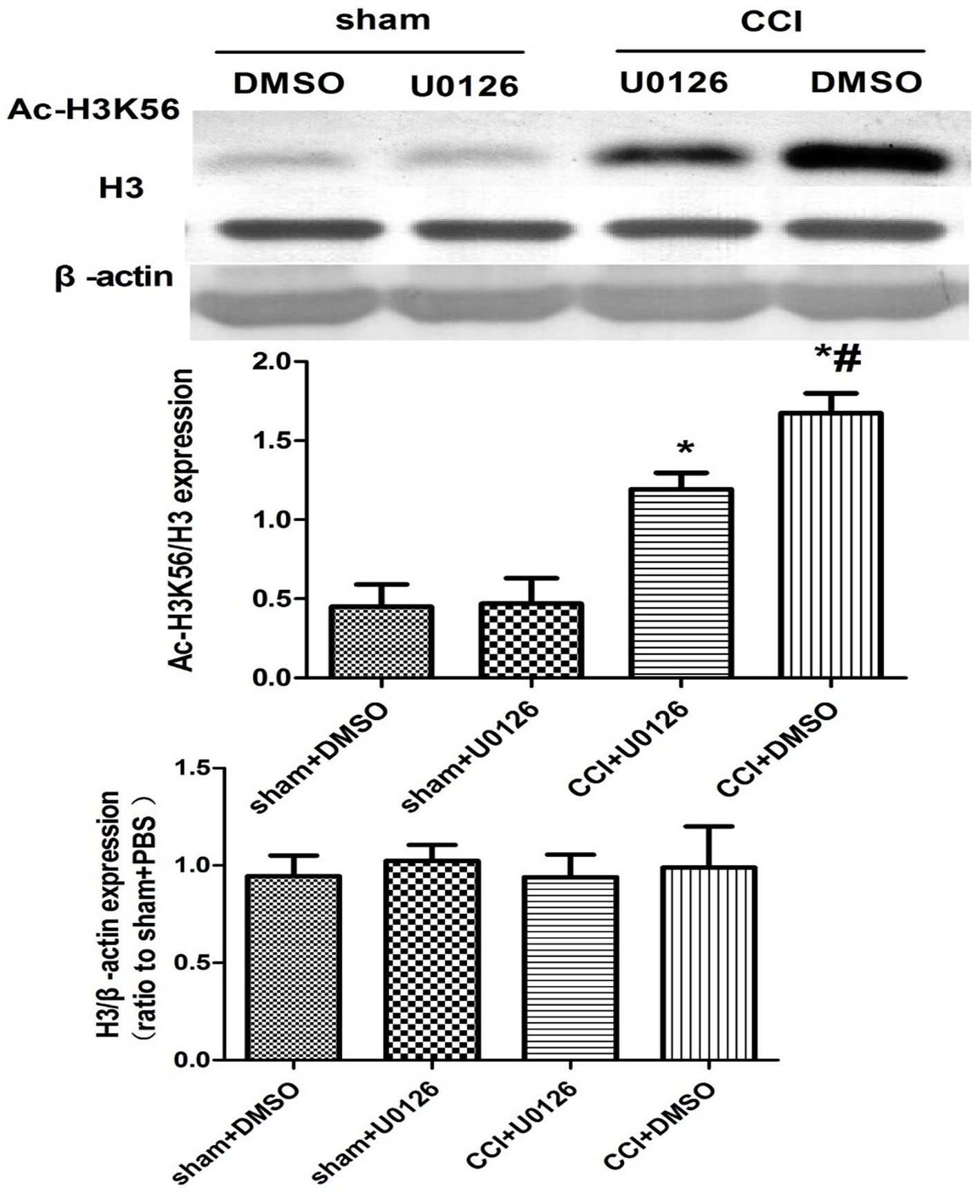 Figure 6. Western blot analysis of Ac-H3K56 expression after ERK inhibition. CSF-CN tissue was harvested 24 h after i.c.v. injection of U0126 (10 μg). Western blotting using an anti-Ac-H3K56 antibody revealed that ERK inhibition significantly reduced H3K56 acetylation compared to the CCI + DMSO controls. p < 0.05 versus sham + DMSO; #p < 0.05 versus CCI + DMSO, n = 6.