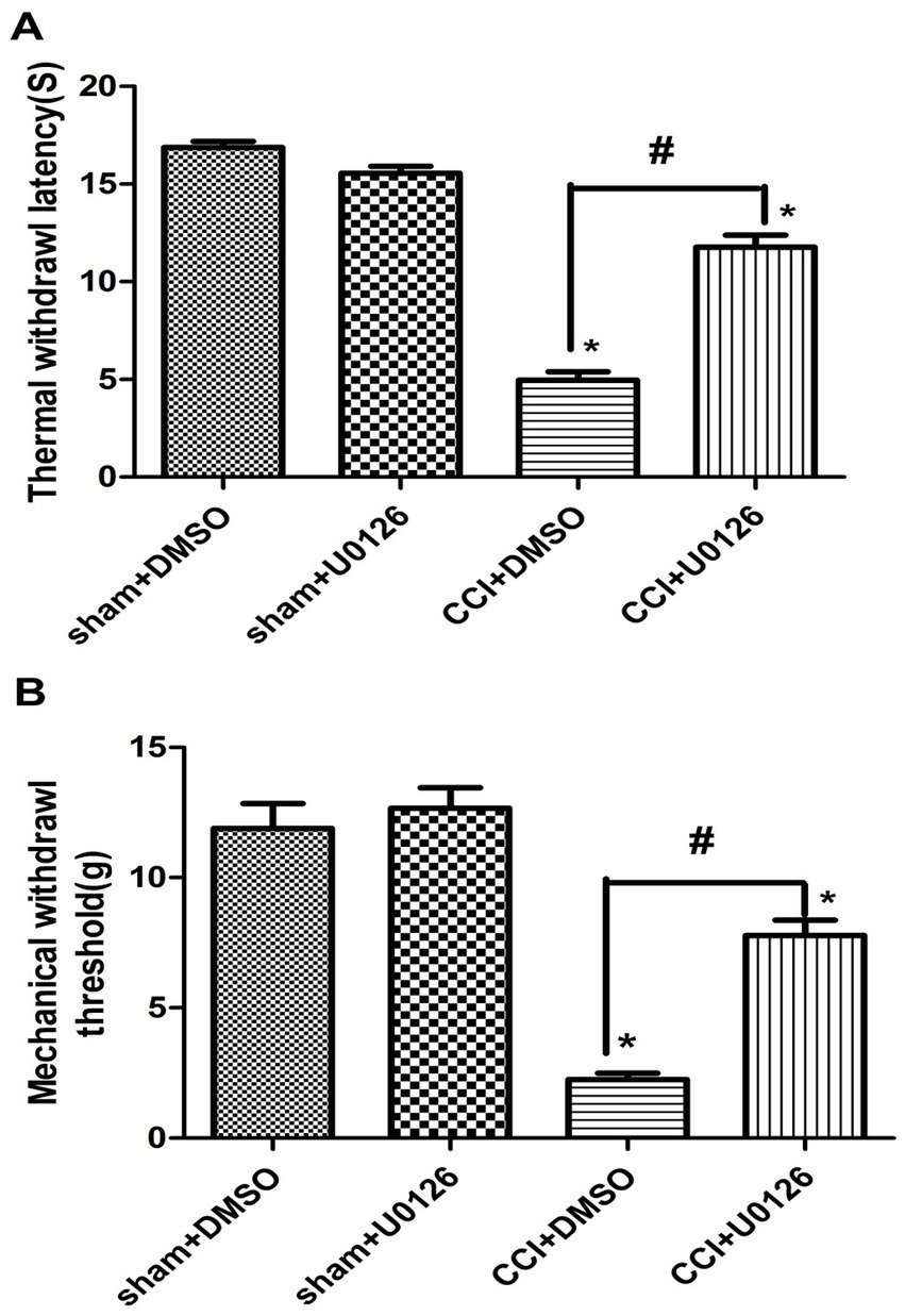 Bar graphs comparing withdrawal responses. (A) Thermal withdrawal latency in sham+DMSO, sham+U0126, CCI+DMSO, and CCI+U0126 groups. (B) Mechanical withdrawal threshold in the same groups. Notable reduction in latency and threshold in CCI+DMSO; partial recovery in CCI+U0126. Asterisks and hash symbols indicate significant differences.