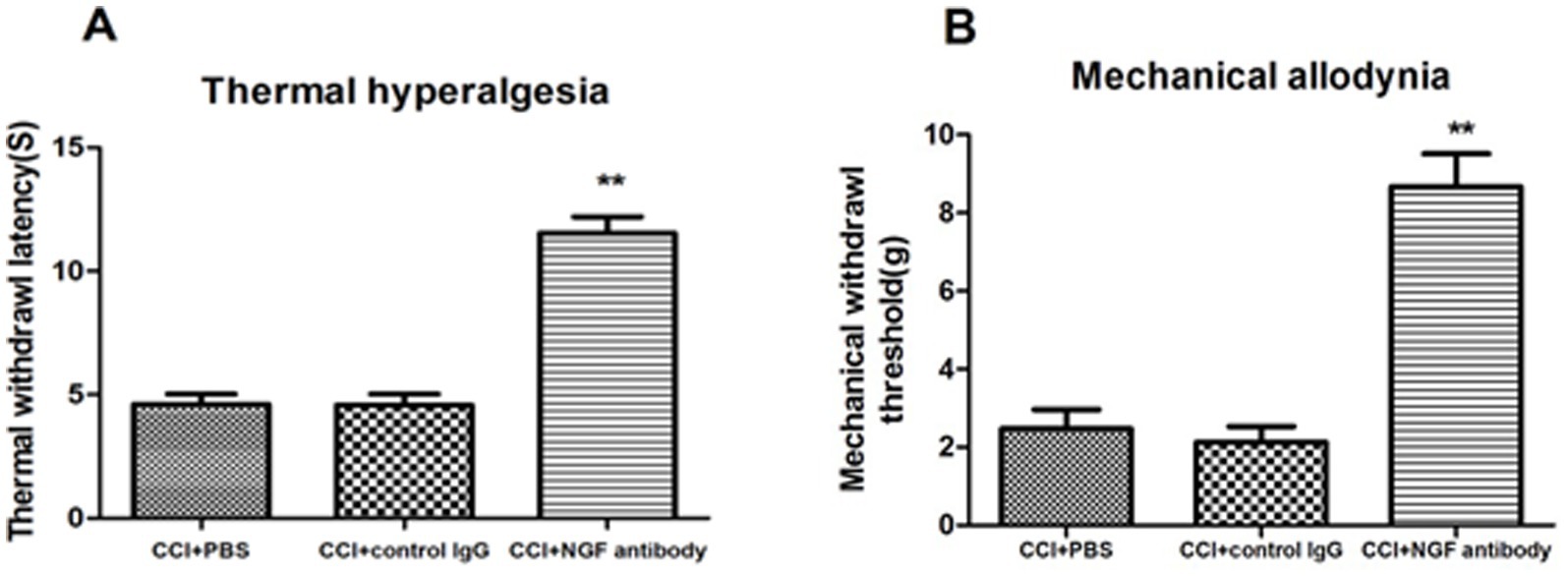 In the CCI rats, both the mechanical withdrawal threshold (MWT) and thermal withdrawal latency (TWL) were assessed 24 h after intracerebroventricular injection of the NGF antibody (10 μg/i.c.v.). The rats treated with the NGF antibody showed a highly significant alleviation of neuropathic pain (NP) symptoms, as evidenced by increased MWT and TWL, indicating a significant reduction in mechanical allodynia (MA) and thermal hyperalgesia (TH), respectively (Figure 3).