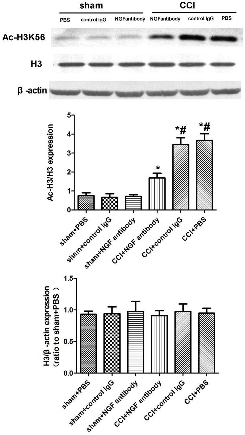 Figure 4. Western blot analysis of Ac-H3K56 expression after NGF antibody administration. Protein extracts from the CSF-CN were collected 24 h after NGF antibody (10 μg, i.c.v.) or PBS injection. Western blotting was performed using an anti-Ac-H3K56 antibody, with β-actin as a loading control. Quantification showed significant downregulation of Ac-H3K56 in the NGF antibody-treated rats. p < 0.05 versus sham + PBS; #p < 0.05 versus CCI + PBS, n = 6.