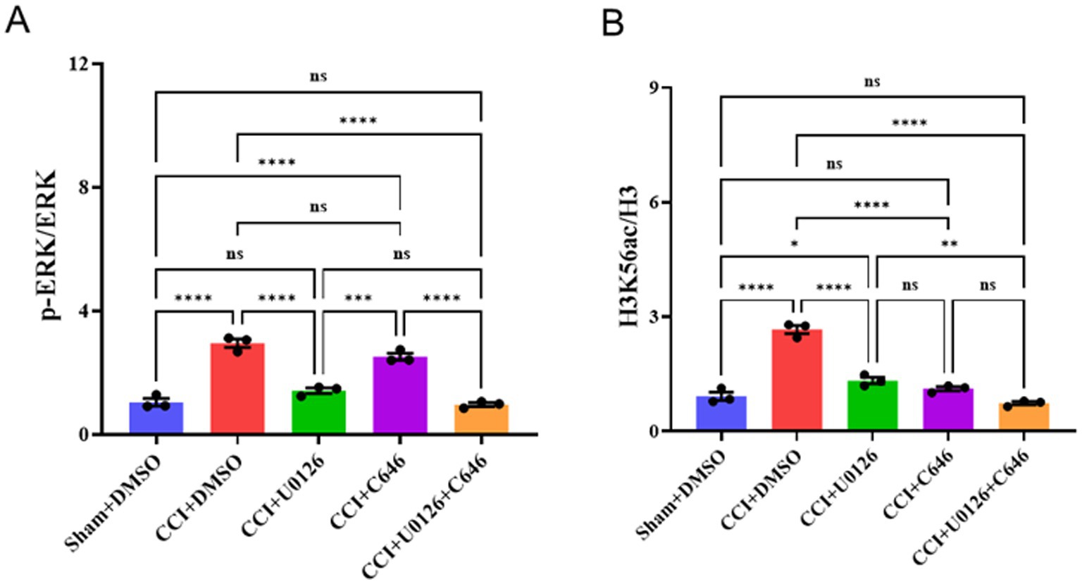 Bar graphs showing the effects of different treatments on p-ERK/ERK and H3K56ac/H3 levels. Panel A displays p-ERK/ERK ratios, while Panel B shows H3K56ac/H3 ratios across various groups, including Sham+DMSO, CCI+DMSO, CCI+U0126, CCI+C646, and CCI+U0126+C646. Significance levels are indicated for comparisons between groups, with labels such as **** for highly significant differences, and ns for non-significant differences.