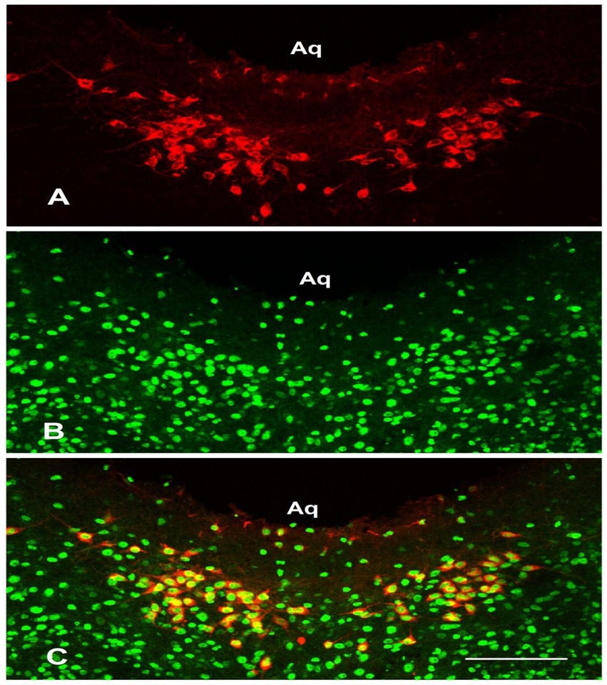 CB-HRP-labeled neurons (red) in the ventral periaqueductal gray (PAG) of the brainstem constitute the cerebrospinal fluid-contacting nucleus (CSF-CN). Dual-labeled immunofluorescence revealed the presence of Ac-H3K56 in the CSF-CN, with Ac-H3K56-immunoreactive neurons (green) located near the midline of the ventral mesencephalic aqueduct (Aq). Dual labeling (yellow) verified the presence of Ac-H3K56 (Figure 2).