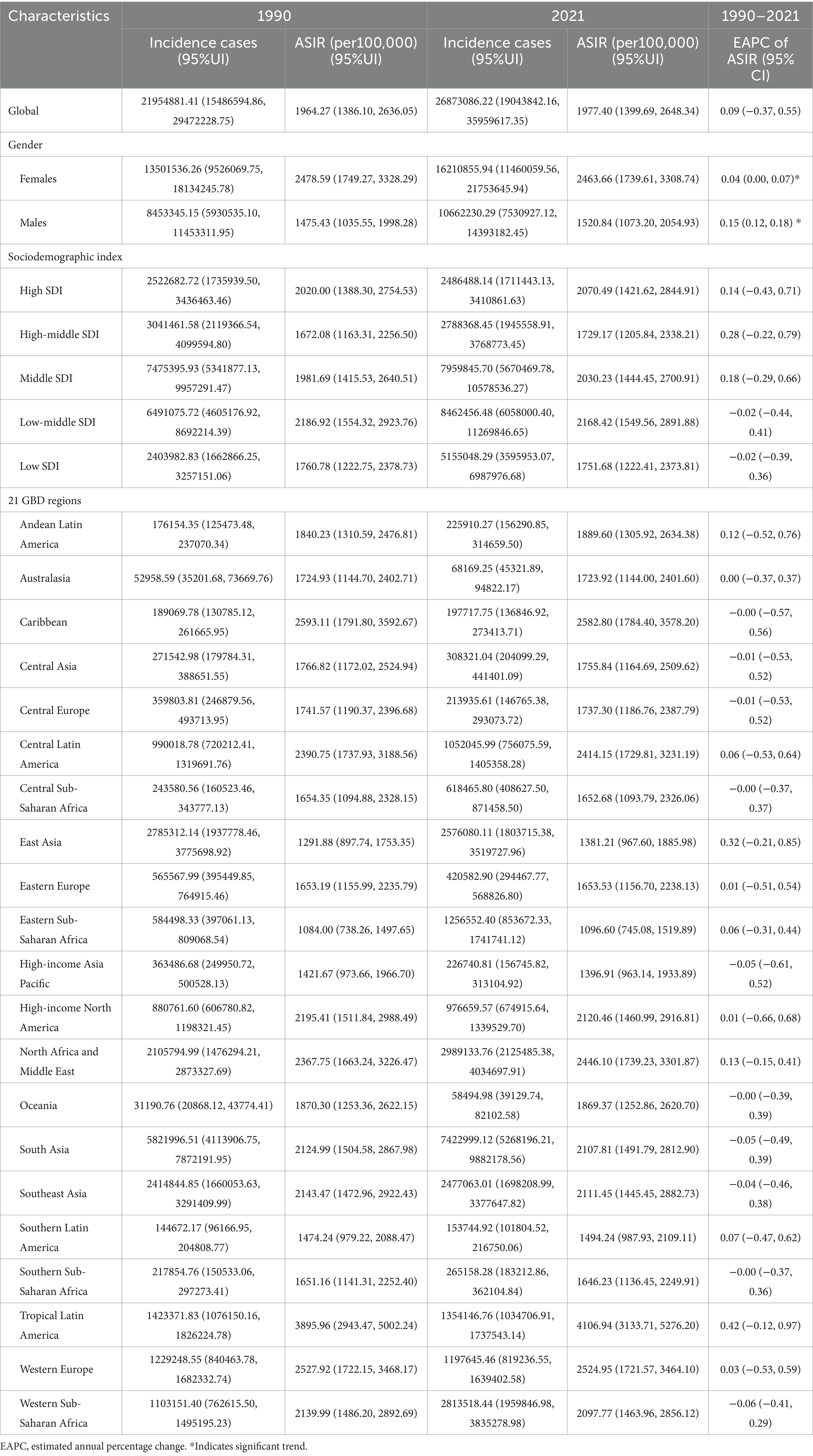 Globally, the incidence, prevalence, and DALY of migraine among children increased significantly (Figure 1; Table 1; Supplementary Tables S1,S2). From 1990 to 2021, individuals aged 5–14 experienced a substantial increase in migraine burden. By 2021, the estimated incidence climbed to 26.87 million cases (95% UI: 19.04–35.96 million), marking a 39.52% rise from the 21.95 million cases (95% UI: 15.49–29.47 million) observed in 1990. The global age-standardized incidence rate (ASIR) increased slightly from 1,964.27 per 100,000 in 1990 to 1,977.40 per 100,000 in 2021. Concurrently, prevalence cases surged by 24.50%, increasing from 78.26 million in 1990 to 97.43 million in 2021, while DALY showed a comparable growth of 24.73%, reaching 3.48 million in 2021 from 2.79 million in 1990.