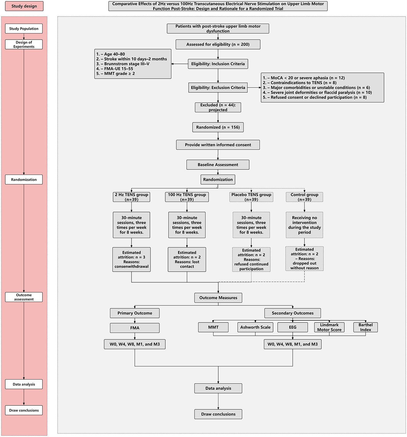 This assessor-blinded, single-center randomized controlled trial with partial participant blinding (active vs. placebo) will be conducted at the Rehabilitation Department of Fuyong People's Hospital, Bao'an District, Shenzhen, Guangdong, China. The trial will compare the effects of 2 Hz and 100 Hz TENS on post-stroke upper-limb motor dysfunction. Participants will be randomized (1:1:1:1) to 2 Hz TENS, 100 Hz TENS, placebo TENS, or a no-TENS usual-care control. The intervention will last 8 weeks, with three sessions per week (Monday, Wednesday, Friday), 30 min per session. Figure 1 depicts the study phases and anticipated participant flow.