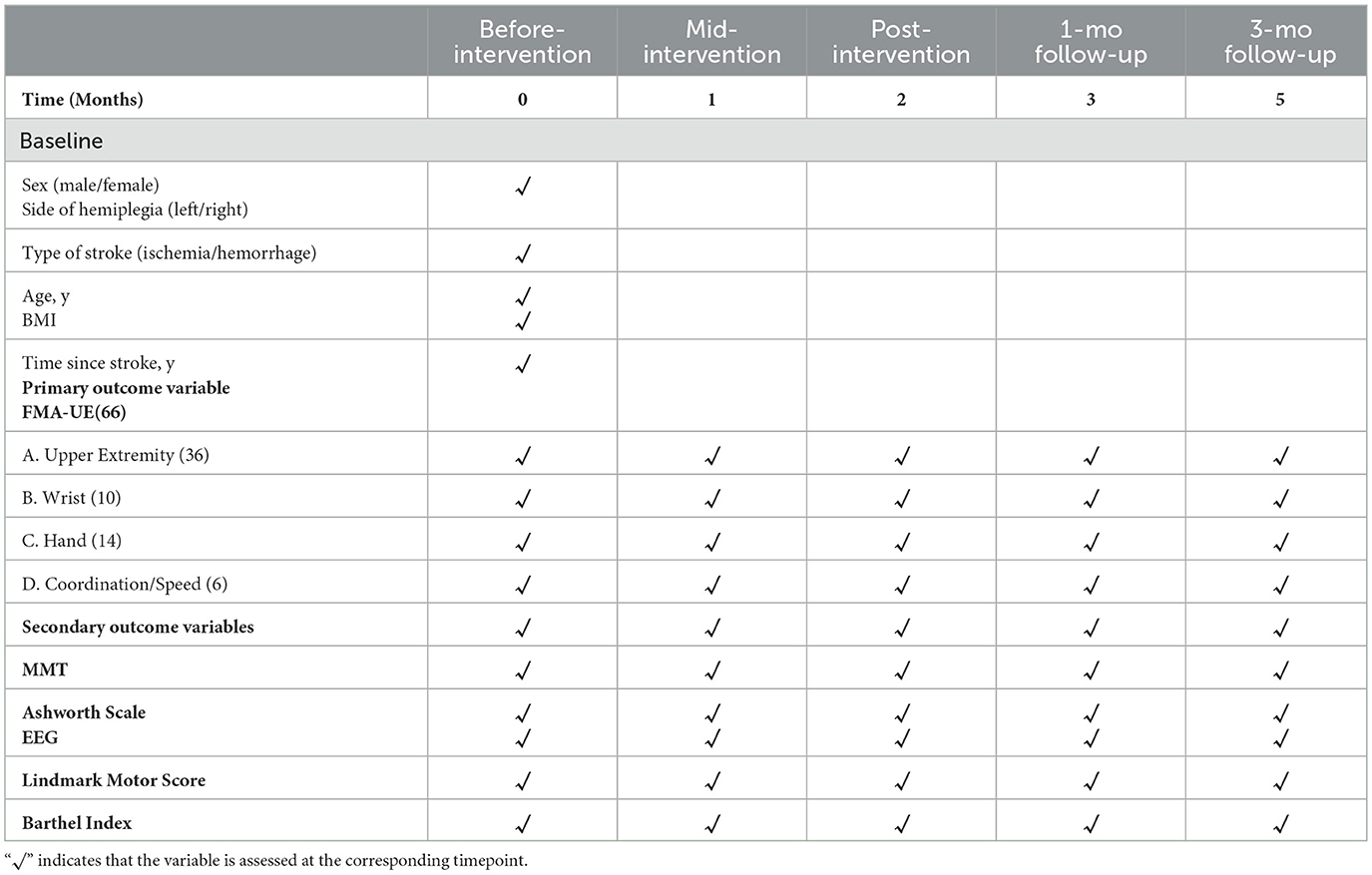 Follow-up assessments are scheduled at 1 month and 3 months after completion of the 8-week intervention. The selection of these timepoints was based on both clinical and neurophysiological considerations (35). The 1-month follow-up corresponds to the early consolidation phase of motor recovery, during which short-term neuroplastic changes may stabilize or continue to evolve. The 3-month timepoint is commonly used in stroke rehabilitation research to evaluate the sustainability of treatment effects, as it reflects a period when spontaneous recovery tends to plateau and long-term functional gains—if present—can be more clearly attributed to the intervention. These intervals are supported by previous randomized controlled trials examining post-stroke motor rehabilitation outcomes.