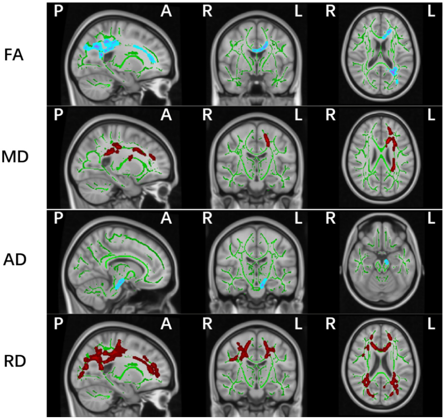 Significant white matter differences between PD-MCI and HC groups (p < 0.05, FWE controlled). FA, fractional anisotropy; AD, axial; MD, mean and RD, radial diffusion. The background image is the standard MNI152 brain template. Green voxels represent the white matter skeleton of all subjects; Red colors denote decreased and blue colors increased cortical thickness in patients compared with controls; L, left; R, right; (P), posterior; (A), anterior.