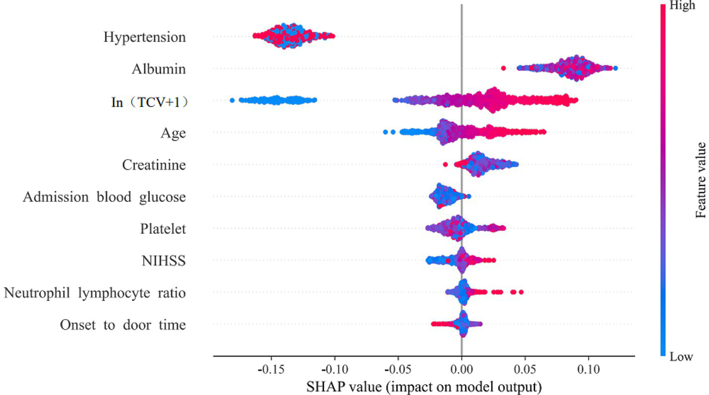 Machine learning (ML) enables high-precision analysis of large clinical datasets using artificial intelligence algorithms. A recent meta-analysis of MT outcome prediction models found that machine learning-based models generally outperform traditional models in predicting the outcomes of neurointerventional procedures, while emphasizing the importance of external validation for model generalizability. However, existing machine learning models for predicting MT outcomes are predominantly based on post-procedural clinical data (12–14). Only a limited number of studies have incorporated only preprocedural clinical data and the simple imaging score ASPECTS, generally overlooking the key imaging features of arterial calcified plaques (15). Intracranial artery calcification (IAC), a common imaging finding on non-contrast cranial computed tomography (CT), is closely associated with atherosclerotic plaques and potentially exerts a more direct impact on MT outcomes (16). Although previous studies have explored the association between IAC and MT outcomes, their conclusions have shown significant discrepancies (17, 18). Therefore, we conducted a comprehensive quantitative assessment of IAC and evaluated its potential as an imaging biomarker for MT prognosis. Additionally, we aimed to develop machine learning models using emergency preprocedural data to aid in the precise identification of AIS patients most likely to benefit from MT.