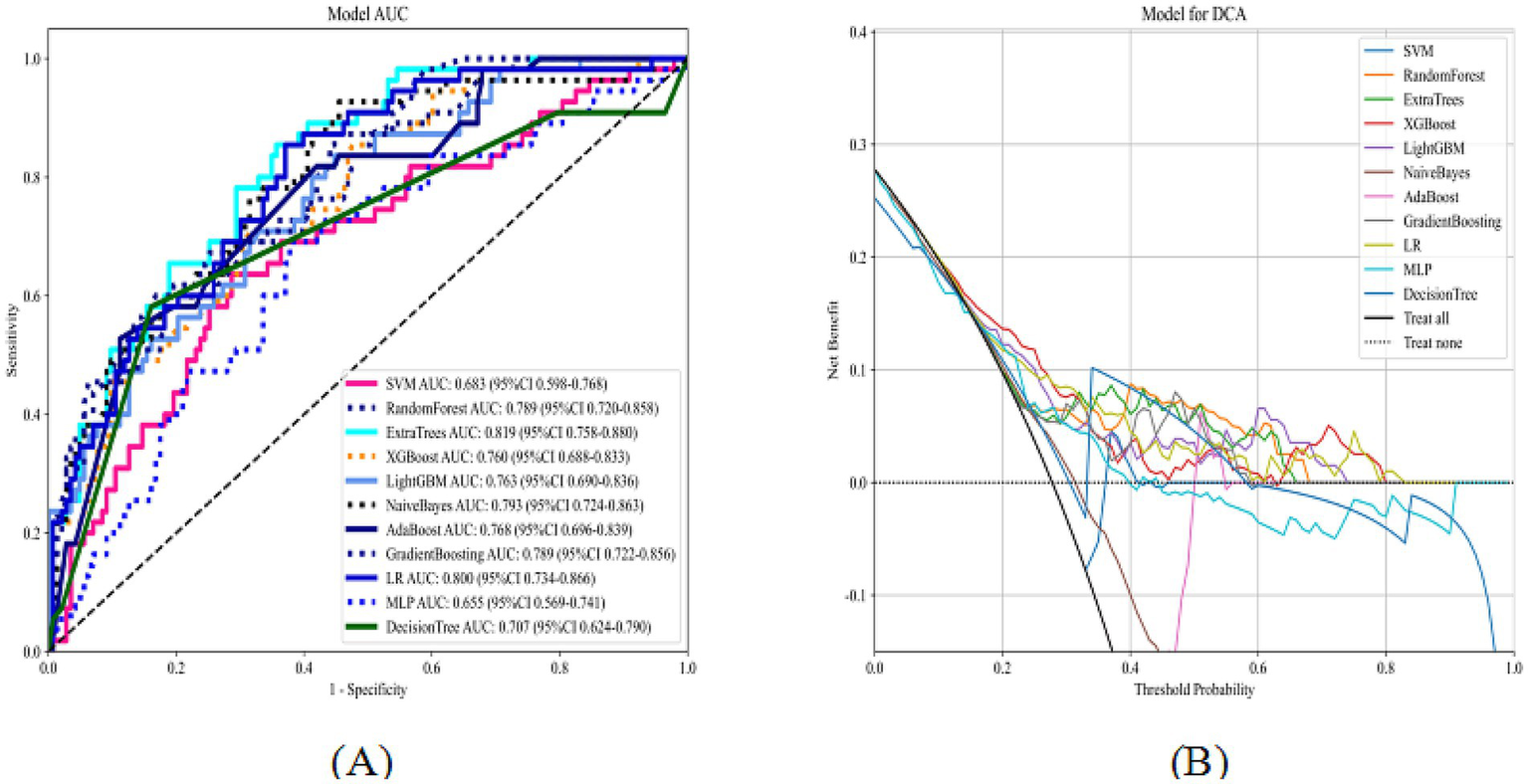 Variables with <10% missing data were included in the analysis. Given this low proportion, missing values were imputed using the mean or median of the training set, depending on the data type. The Central Hospital cohort (n = 625) was randomly divided into training (70%, n = 437) and internal validation (30%, n = 188) sets. The cohort from the Second Affiliated Hospital (n = 198) served as the external test set. Feature selection was performed using least absolute shrinkage and selection operator (LASSO) regression. 5-fold cross-validation was conducted on the training set, and a random search method was employed for hyperparameter tuning. Eleven machine learning algorithms were trained using Python 3.8 and Scikit-learn: Support Vector Machine (SVM), Random Forest, Extra Trees, Extreme Gradient Boosting (XGBoost), LightGBM, Naive Bayes, Adaptive Boosting (AdaBoost), Gradient Boosting, Logistic Regression (LR), Multilayer Perceptron (MLP), and Decision Tree. Internal and external validations were performed, and model performance was evaluated using the area under the ROC curve (AUC) and decision curve analysis (DCA). The optimal model was selected through a holistic assessment of multiple performance metrics, including AUC, accuracy, sensitivity, and specificity, with statistical comparisons conducted via DeLong’s test. Model interpretability was further enhanced using Shapley Additive Explanations (SHAP).