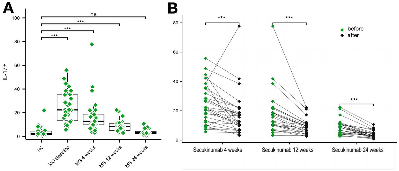 Secukinumab demonstrated rapid and sustained clinical benefits in AChR+ gMG, linked to suppression of the Th17/IL-17 pathway. These findings highlight IL-17 inhibition as a promising targeted strategy for MG. Limitations include small sample size and retrospective design, warranting validation in larger randomized trials.