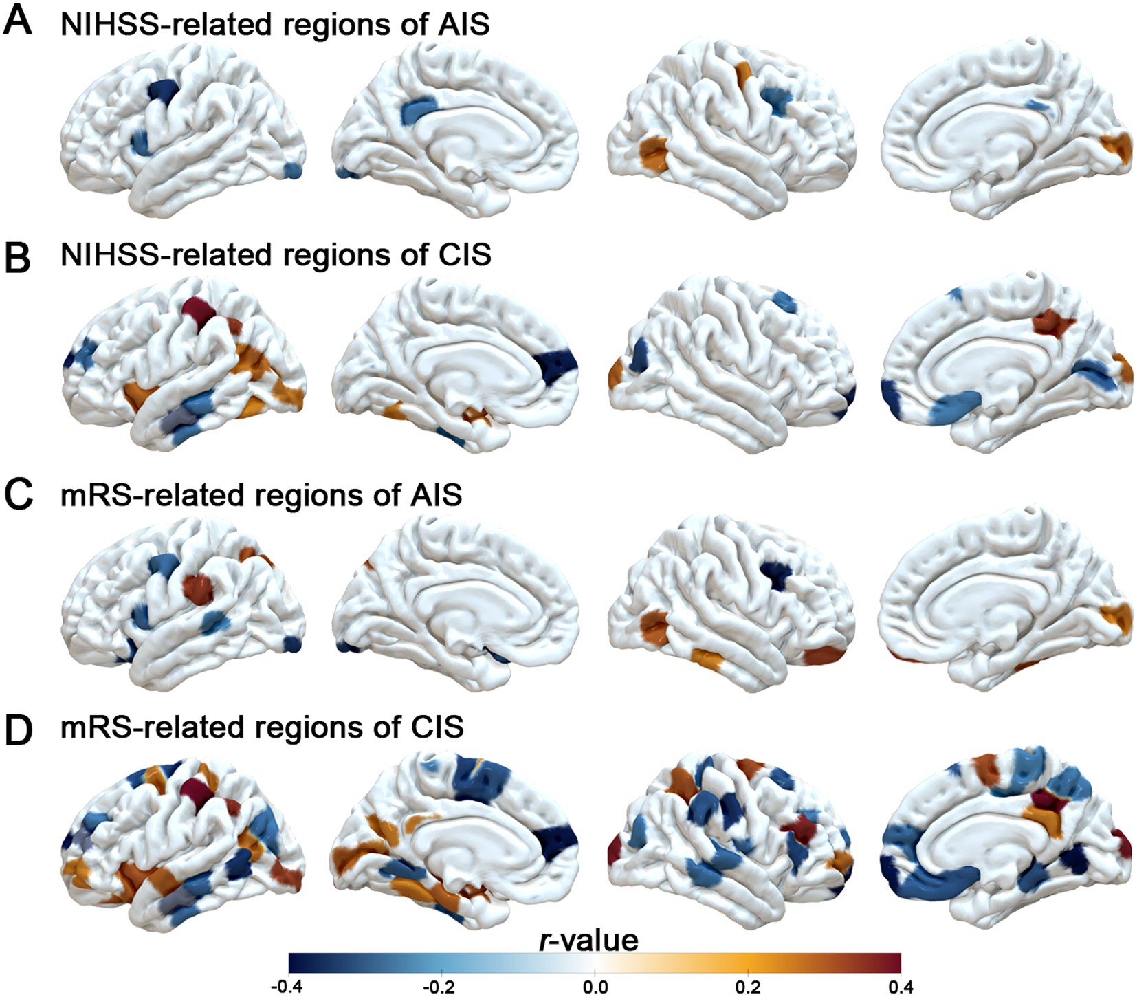 Figure 2. Associations between regional MSN strength and clinical scores. (A, B) Brain regions where MSN strength correlates with NIHSS scores in AIS and CISpatients. (C, D) Brain regions where MSN strength correlates with mRS scores in AIS and CIS groups. Color scale indicates correlation coefficients (r-values) without FDR correction, with positive and negative associations shown in orange and blue, respectively.