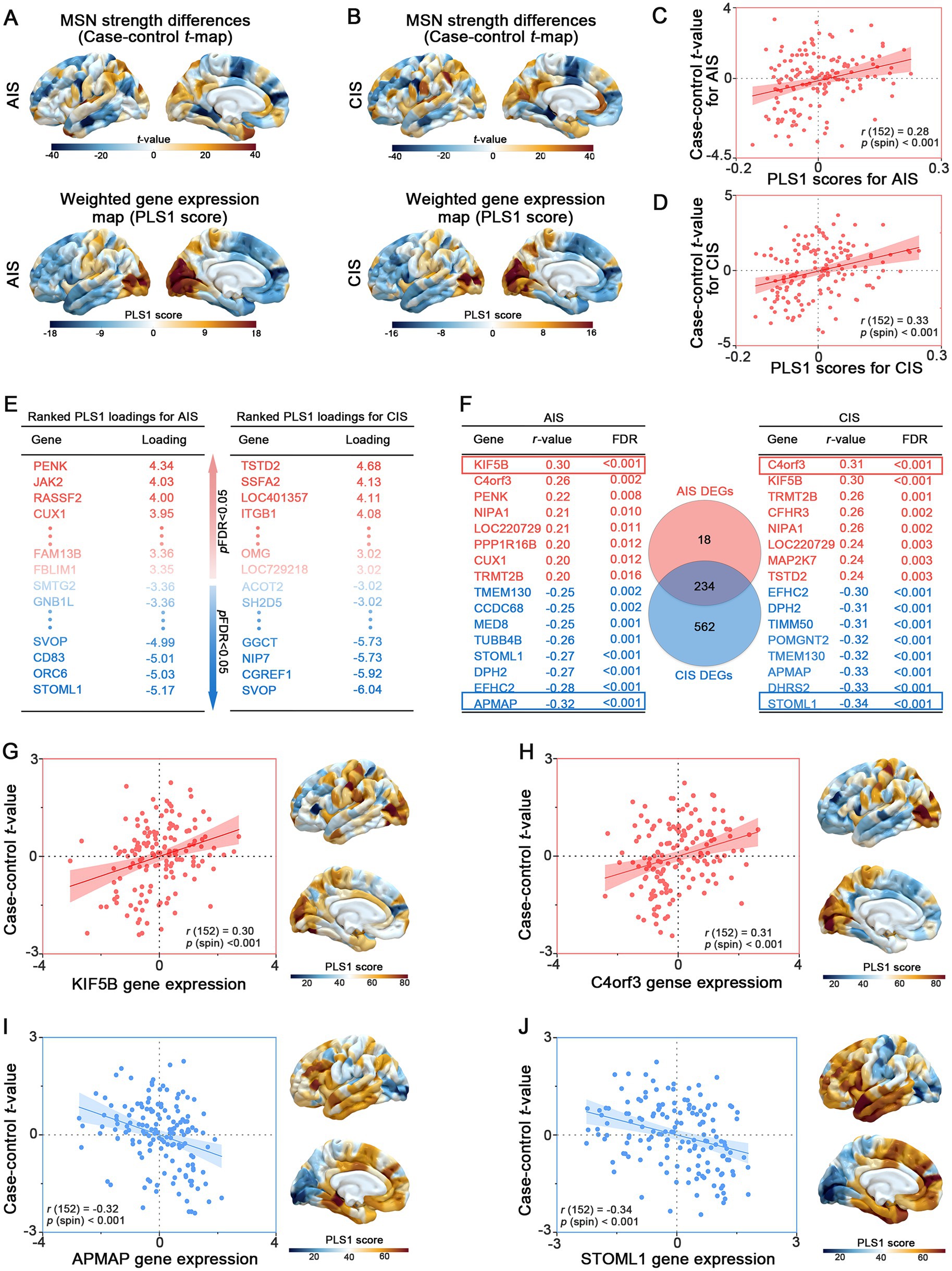Figure 3. Transcriptomic correlates of MSN differences across stroke stages. (A, B) Case–control t-maps of MSN strength differences and PLS1-weighted gene expression maps in AIS and CIS groups, showing spatial correspondence. (C, D) Scatterplots showing significant correlations between regional PLS1 scores and MSN t-values in AIS (r = 0.33) and CIS (r = 0.28) groups. (E) Top differentially exploratory expressed genes (PLS1+ and PLS1−) identified for AIS and CIS groups based on PLS1 loading scores. (F) Shared and stage-specific differentially exploratory expressed genes (DEGs) associated with regional MSN differences. Left and right tables list representative DEGs in the AIS and CIS groups, respectively, ranked by Spearman r-values (FDR < 0.05); positively and negatively correlated genes are shown in red and blue. The central Venn diagram illustrates the number of overlapping and unique DEGs between AIS and CIS groups. (G–J) Examples of positively correlated genes (KIF5B, C4orf3) and negatively correlated genes (APMAP, STOML1), showing gene expression-MSN associations and spatial expression patterns aligned with t-map distributions.