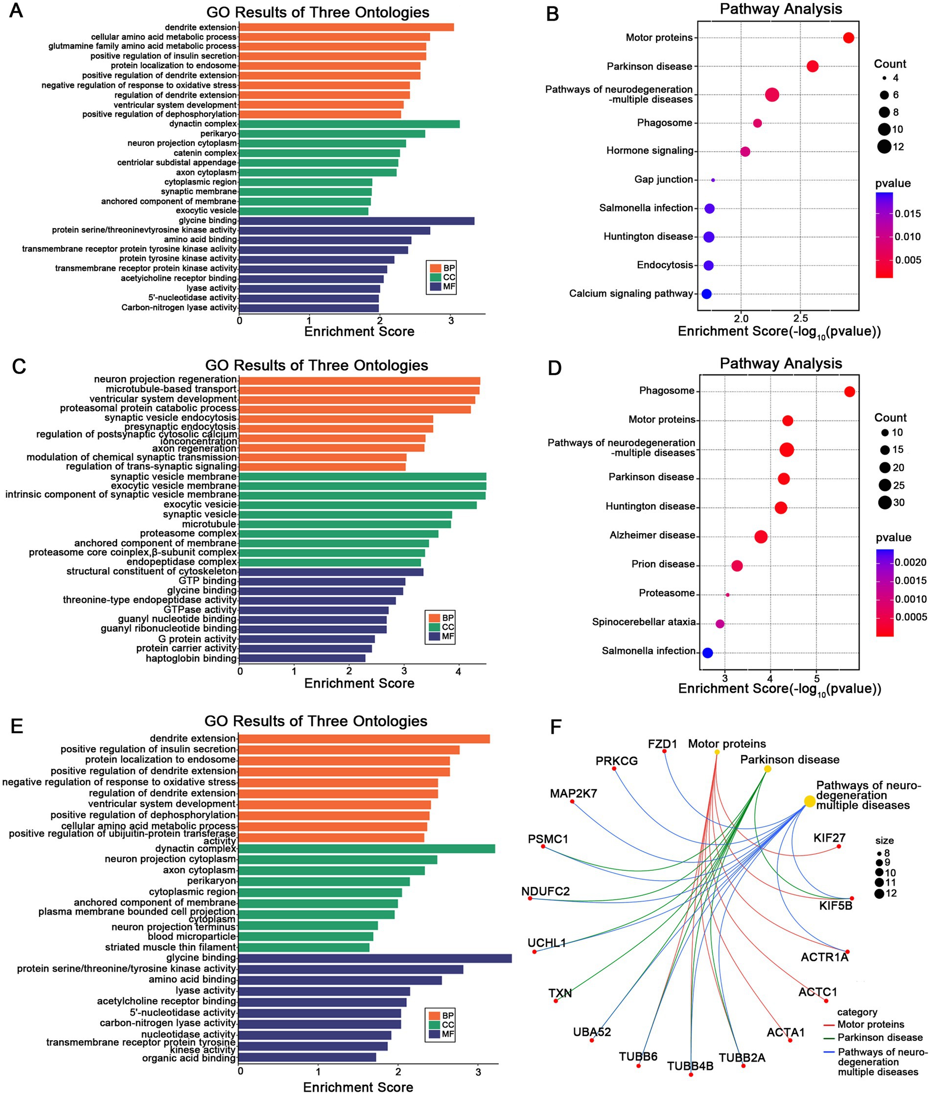 To elucidate the biological signatures across cortical MSN differences, GO and KEGG enrichment analyses were performed on DEGs identified in the AIS and CIS groups. In the AIS group, biological process (BP) terms were mainly enriched in dendritic extension, cellular amino acid metabolism, and insulin secretion regulation. Cellular component (CC) terms involved neuron projection cytoplasm and synaptic membranes, while molecular function (MF) terms were related to glycine binding and protein kinase activity (Figure 4A). KEGG analysis indicated significant enrichment in motor proteins, Parkinson disease, and neurodegeneration pathways (Figure 4B). In the CIS group, BP terms highlighted neuronal projection regeneration and microtubule-based transport. CC terms involved synaptic vesicle membranes and proteasome complexes, and MF terms were enriched in GTP binding and nucleotide binding (Figure 4C). KEGG analysis showed overlap with AIS, including motor proteins, phagosome, and neurodegenerative disease pathways (Figure 4D). Analysis of overlapping DEGs revealed common enrichment in dendritic extension, axon cytoplasm, and organic acid binding (BP, CC, MF respectively; Figure 4E). Shared pathways were mainly related to motor proteins, Parkinson disease, and multiple neurodegenerative disorders (Figure 4F). Gene-pathway network analysis identified hub genes bridging key biological functions. FZD1 and PRKCG were linked to motor protein regulation and neuronal signaling. KIF27, KIF5B, and ACTR1A were associated with axonal transport and cytoskeletal organization. TUBB6, TUBB4B, and TUBB2A were central to microtubule stability. PSMC1, NDUFC2, UCHL1, TXN, UBA52, and MAP2K7 were related to protein degradation and oxidative stress regulation. These hub genes are associated with cortical MSN differences in stroke and may reflect coordinated changes related to neuronal structure, intracellular transport, and protein homeostasis.